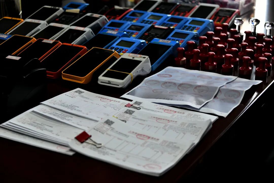 为了使客户的报销凭证更齐全,王某团伙还冒领了大量POS机用于伪造用餐结账银行流水单证,并私刻了大量餐馆的发票专用章,盖在自行伪造的点餐明细单上。
