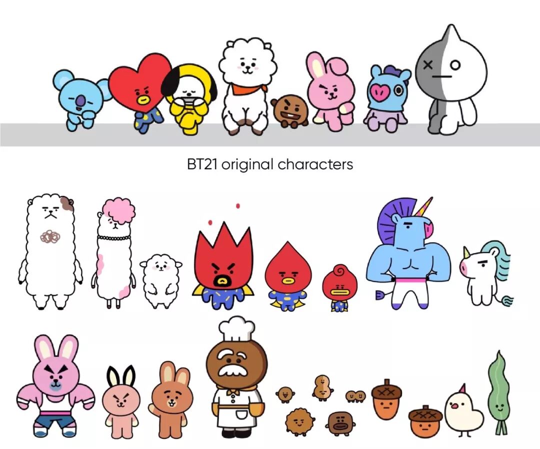为BT21新设计的各种人物,传达了BT21亲朋好友的设计理念。这些不同的角色版本也受到BTS粉丝的喜爱。