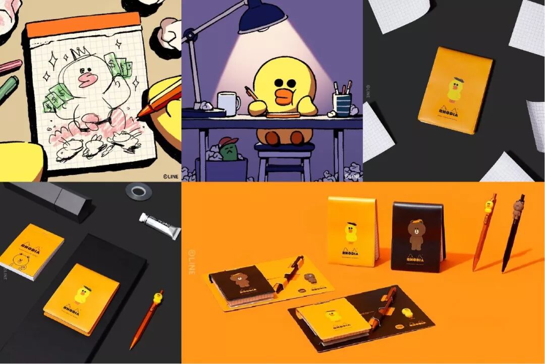 LINE Friends与法国文具品牌Rhodia的合作,Rhodia是一个深受艺术家与设计师喜爱的品牌。LINE Friends可爱的角色形象被很好地应用在Rhodia充满奢华与艺术感的品牌形象当中。