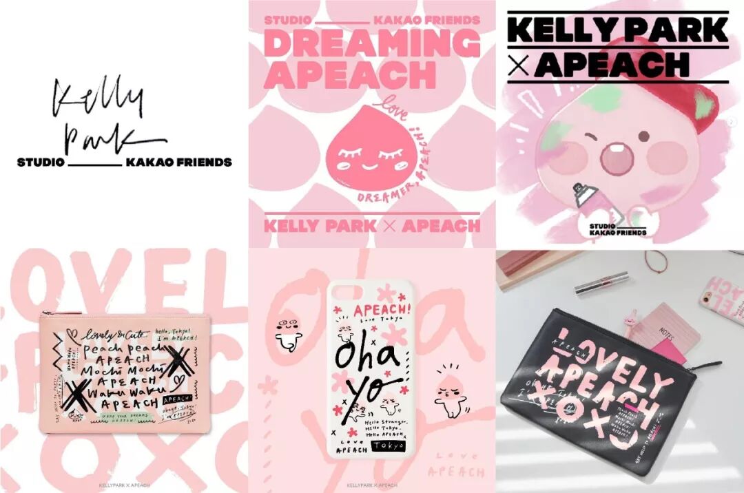 Kakao Friends had a collaboration between calligraphy artist Kelly Park and Apeach to open Kakao Friends Tokyo store. Kakao Friends Tokyo runs 'Studio Kakao Friends', which collaborate with creators from various fields around the world. The first project was with Korean calligraphy artist Kelly Park. Apeach's lovely pink identity and Kelly Park’s powerful and stylish calligraphy were combined and created trendy and unique products.