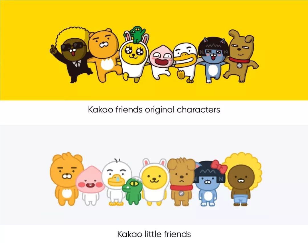Kakao Friends设计了一个婴儿版的角色家族“Kakao Little Friends” ,它们与原始角色并没有太大区别,形象却更柔和而温暖。此版本被应用于Kakao Friends的各种产品,尤其是与儿童相关的产品。