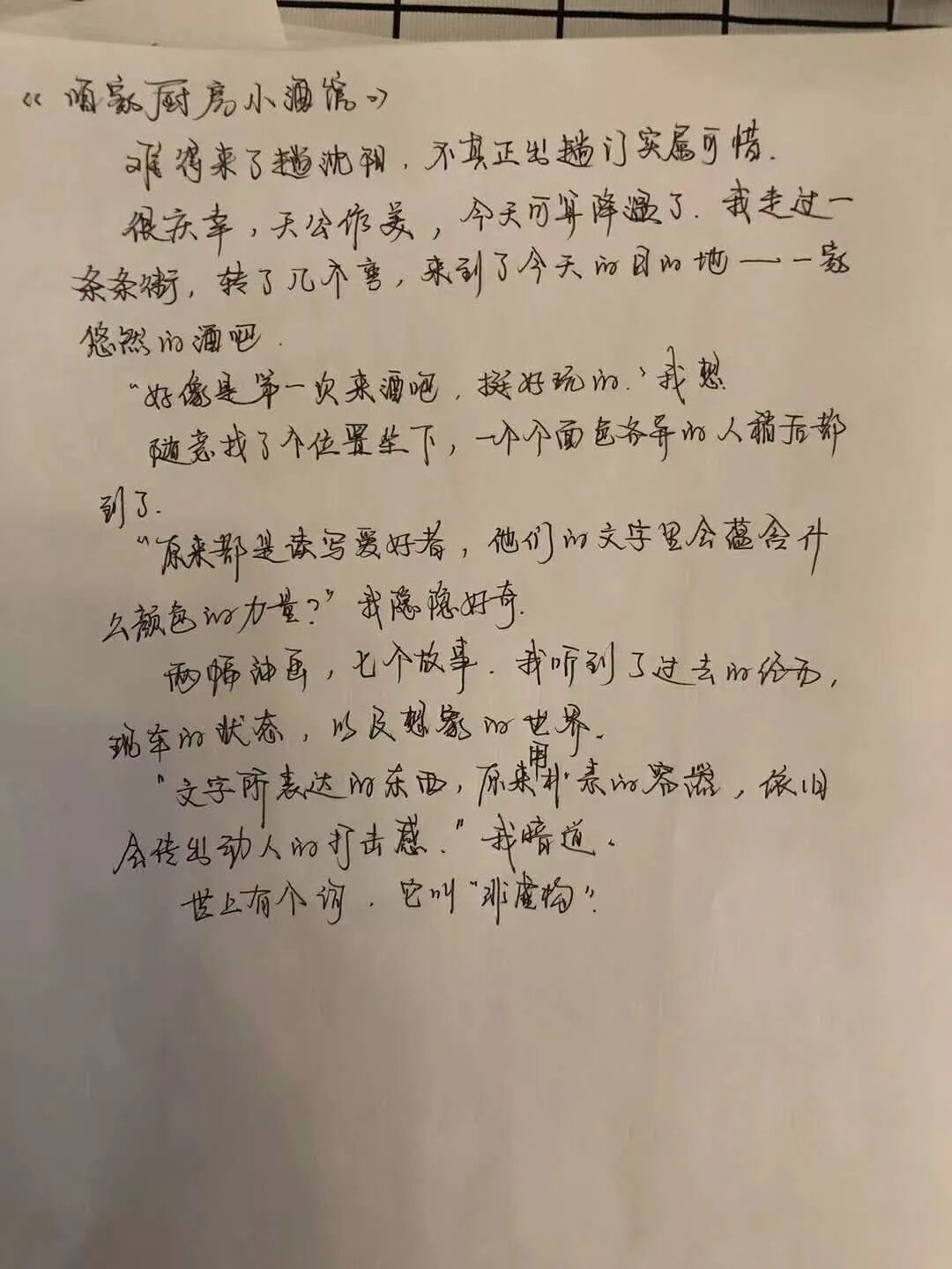 广州场的主持人大瑶原本就是职业编辑,因而能富有经验地给出最中肯的建议。笔会结束后,她有些激动地向我介绍了学员林格——林格外表看上去是一个很安静斯文的小姑娘,第一轮“话题写作”的时候她磨到最后一个发言,声音也柔柔弱弱的,到了第二轮写作训练时,她就踊跃地举手,念出自己的作品,她说她喜欢无聊,害怕跟别人说话,但是很享受和自己对话的过程。