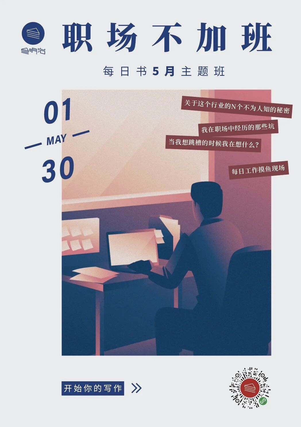 我们在每日书的原有生态上做了很多新鲜的尝试:聚焦性别话题的“女性主题班”和“男性主题班”,关注成长与教育的“写字妈妈班”,聚众吸猫撸狗的“萌宠主题班”,从线上走到线下的“每日纸书班”,书写食物记忆的“美食主题班”,还有上个月邀请身处不同地区的写作者参与的“世界公民班”。这个月,我们选择的主题就是——职场。