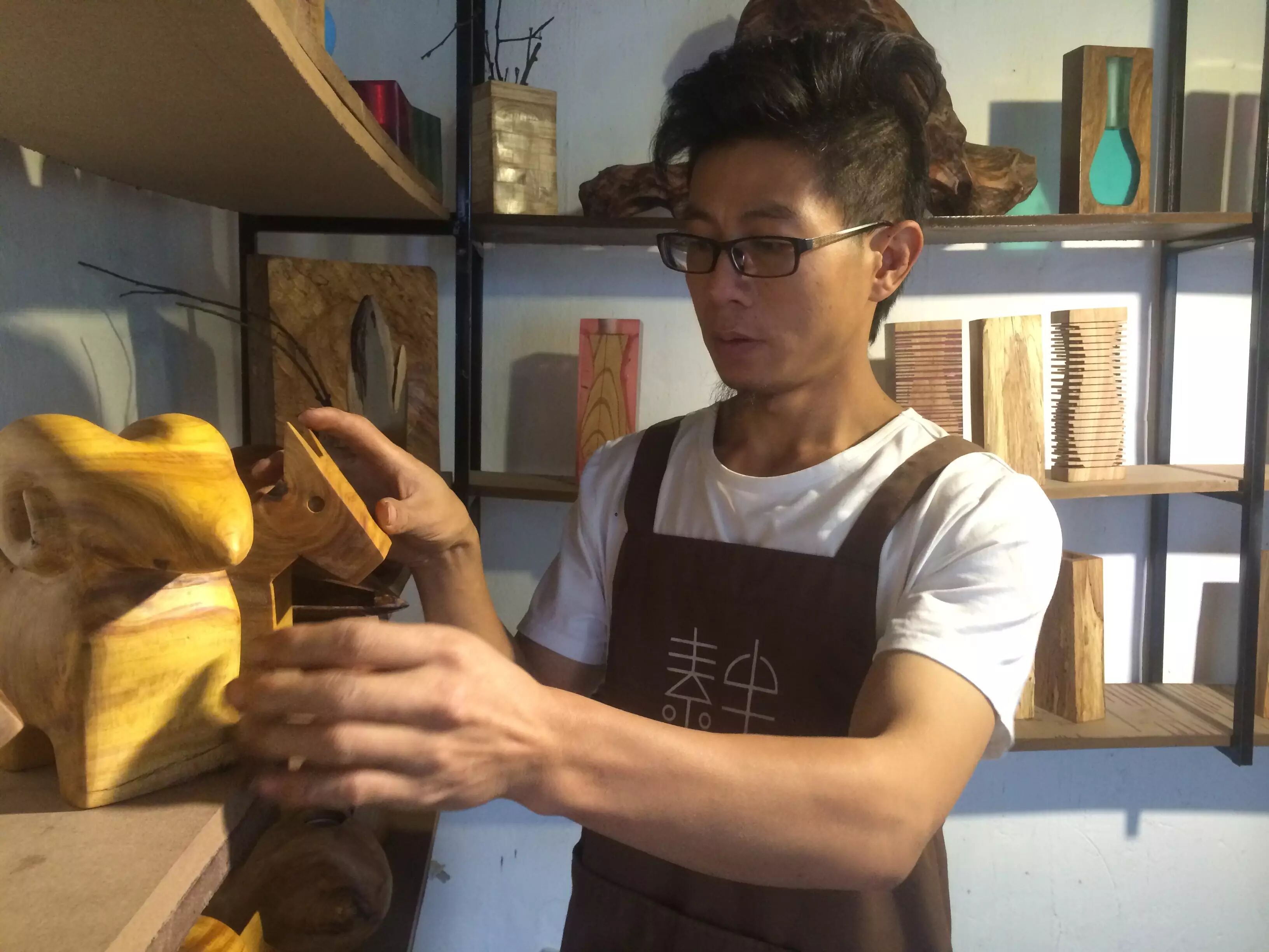 有一次,他没有握住把手,切割盘松动,滑了出去,伤到他的脚踝,踝骨那里缝了十几针。去年十一月到今年过年前,他和四弟,还有一位老师傅,三个人做了两、三百件初期的作品,比如伸懒腰的木头猫,模仿猪鼻子做的笔筒。带着这些产品,他去了深圳、苏州、上海,这三座他曾经工作过的城市,去听听朋友们的反馈。