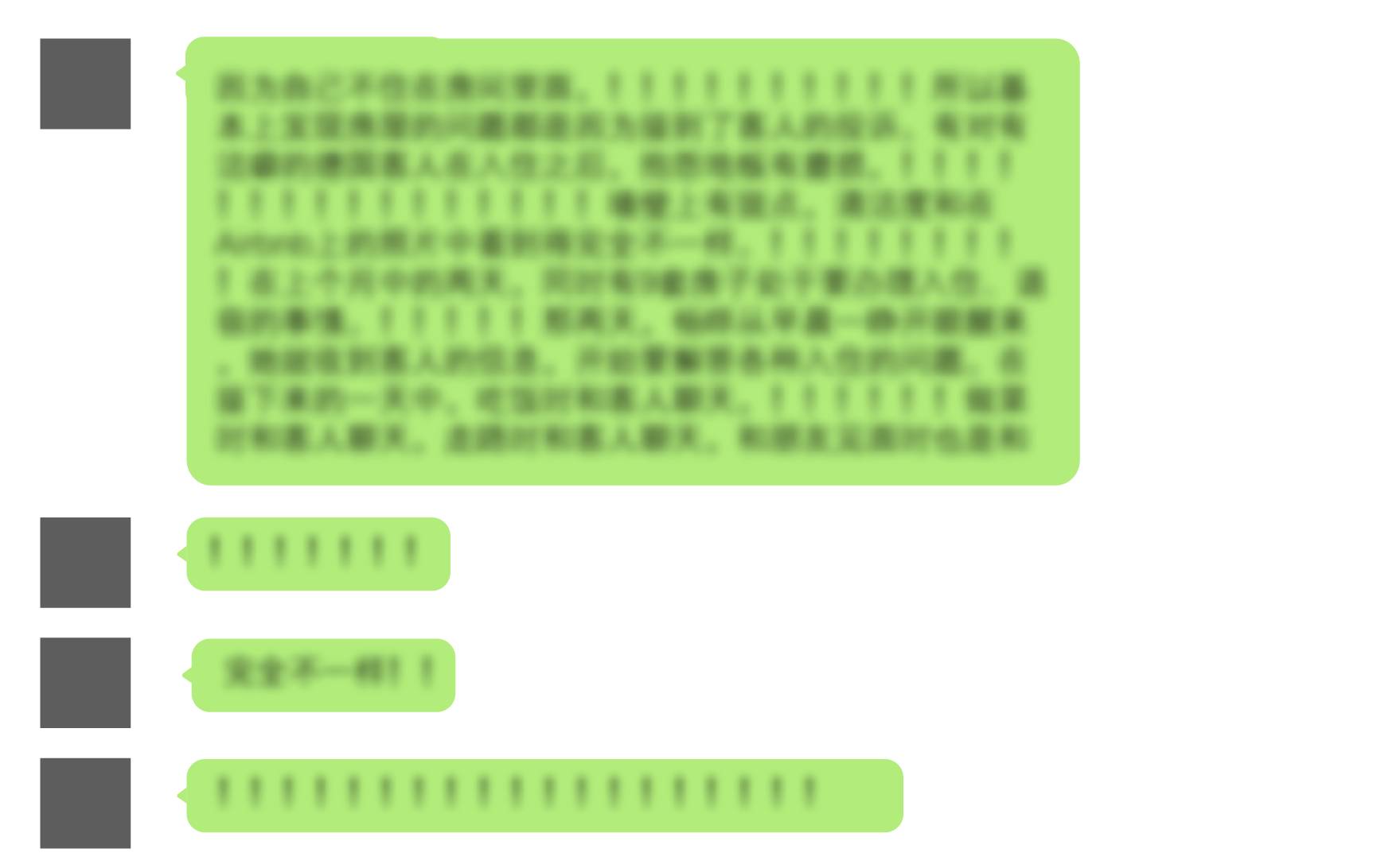 因为自己不住在房间里面,所以基本上发现房屋的问题都是因为接到了客人的投诉。有对有洁癖的德国客人在入住之后,抱怨地板有磨损,墙壁上有斑点,清洁度和在Airbnb上的照片中看到得完全不一样。他们给杨晔发了很长很长的信息,附带许多感叹号。