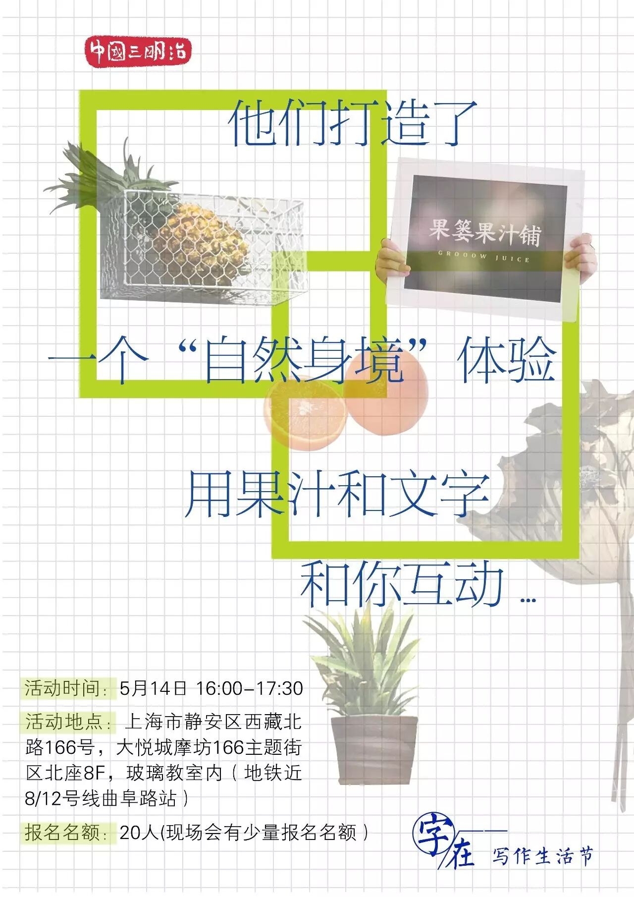 5月14日,16:00-17:30,上海大悦城,果篓和三明治一起邀请你来体验“自然身境”,感受自己身体里的大自然。