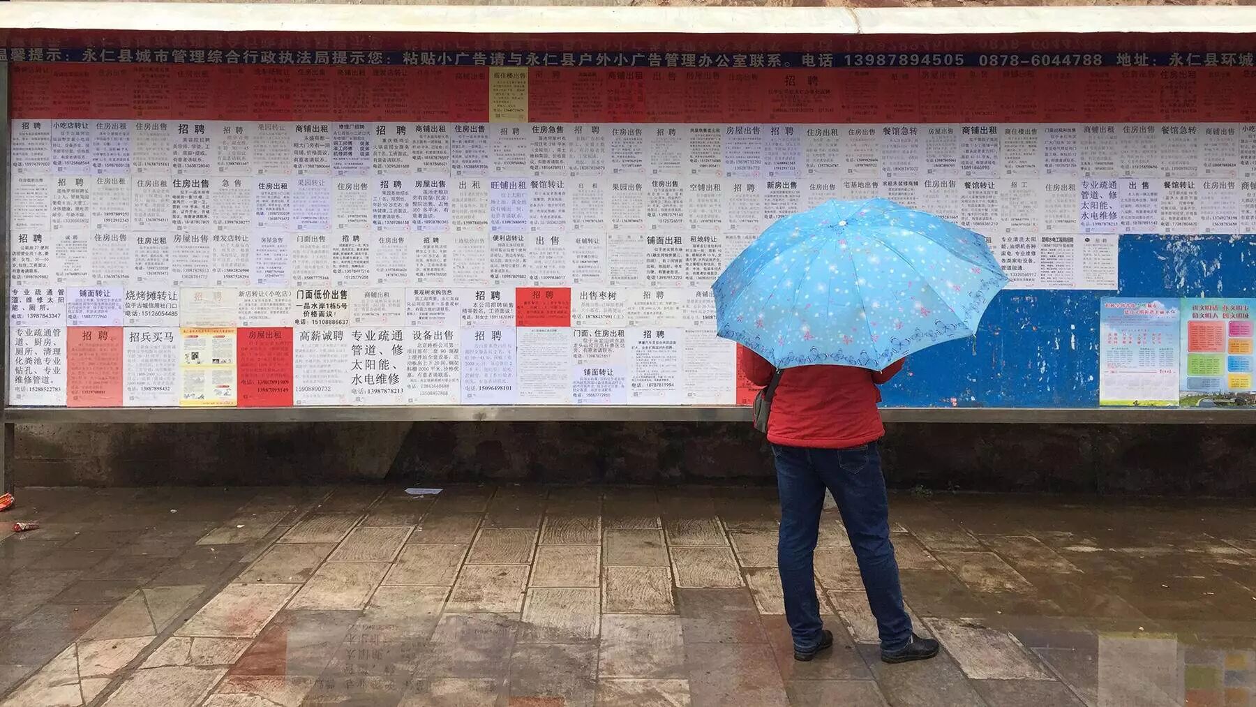 桥下的小广告贴了整整一面墙,除了住房出售或出租以外,有大量的铺面转让信息,小吃店、烧烤店、洗车场、果园等都以发展其他产业为由转让。