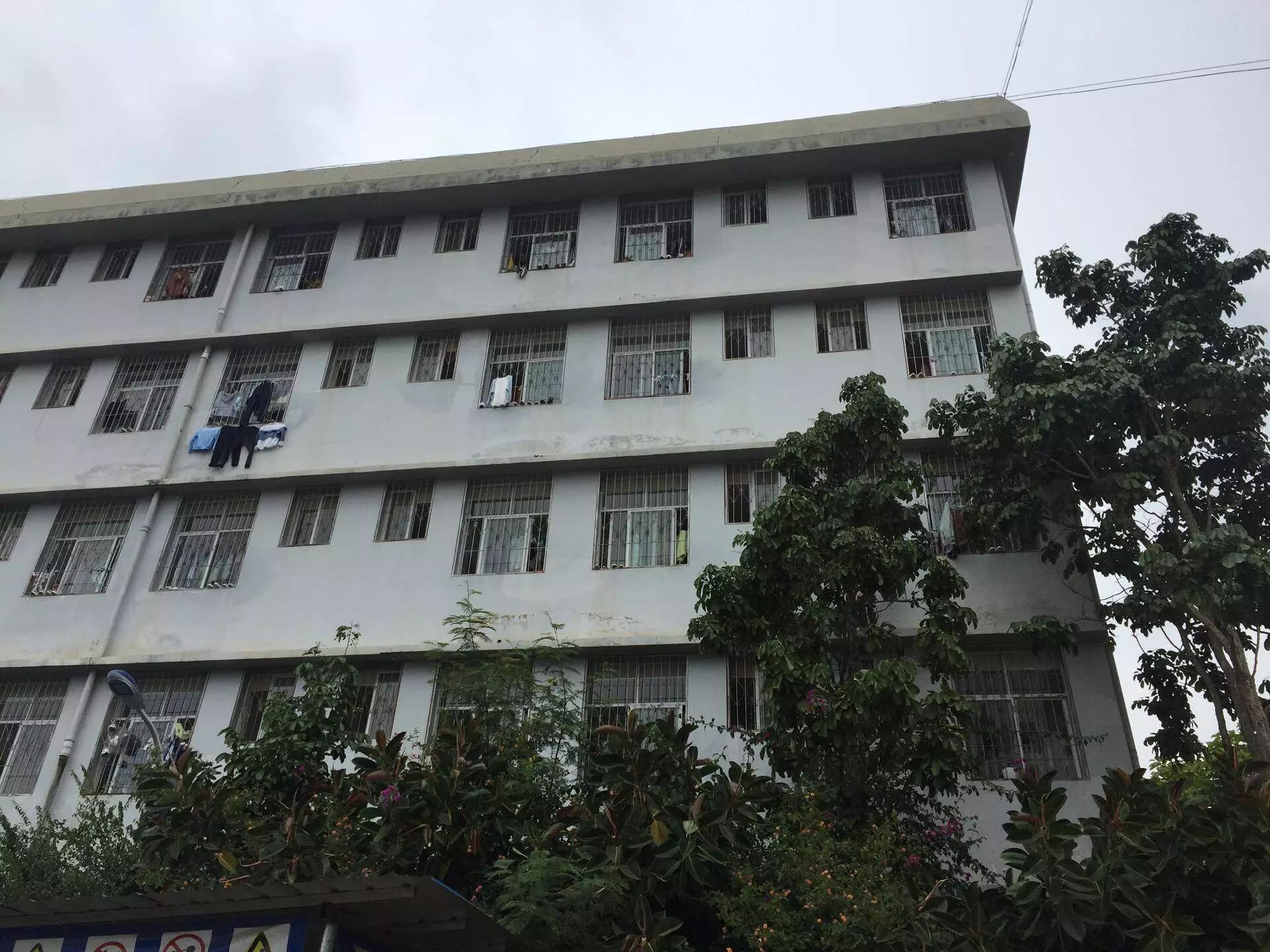 宿舍楼的窗子全部装了栏杆,球鞋的脑袋有意无意地探出来,不下雨的时候,也有几件衣服伸到窗外。二楼被紫色的叶子花遮住了阳光,旁边一株印度榕不甘示弱地往上生长。