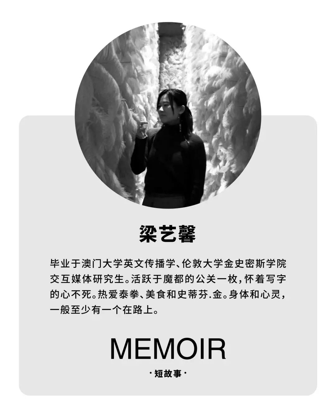 中国人民大学美学硕士,三明治作者、破茧计划1.0作者,关注城市文化题材,作品被收入《破茧001》等书中,主要作品有《“北京深漂群”:雾霾移民群体写照》、《SNH48粉丝的“偶像养成”游戏》、《年轻“猫奴”的日常:他们都为猫付出了什么?》。
