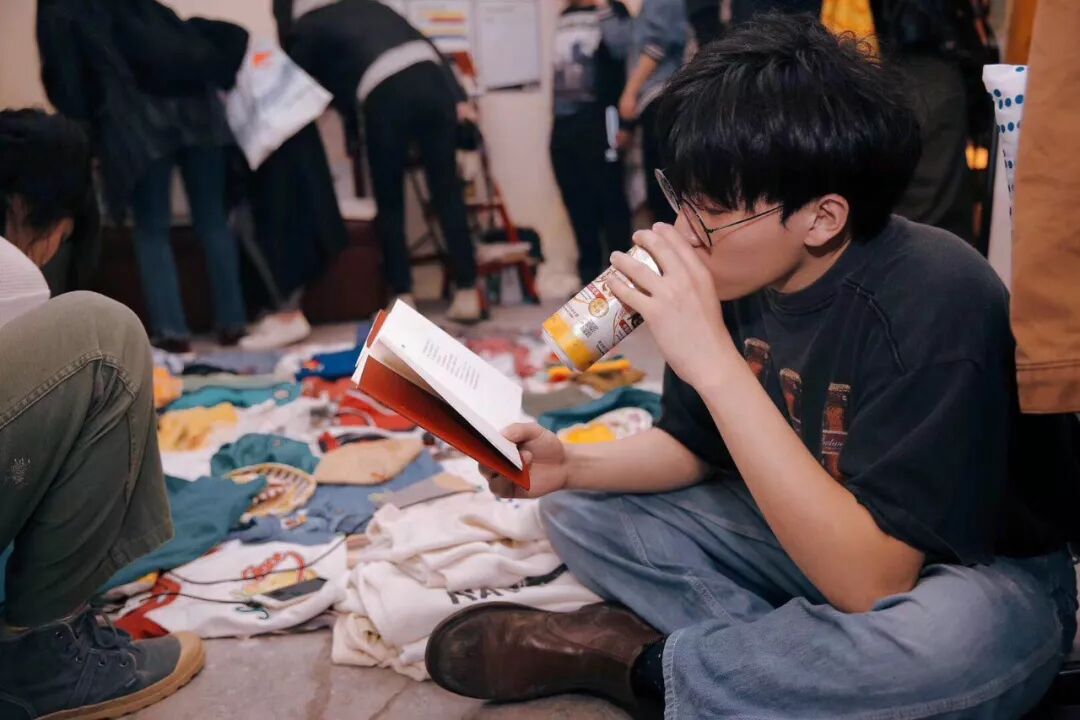 推开门,里面都是人,伴随着电子音乐和不太明亮的灯光,能看到透明的模特,人群围着不同的摊位,古着衬衣、首饰品、纹身贴,其中还有“上海明室”的谢旺,地上摆着各种英文旧书、二战图徽,他可能是现场唯一的中年人。DJ 在打着碟,我进入另一个房间,我在一个沙发上坐稳,感觉这里像一个迷宫一样。