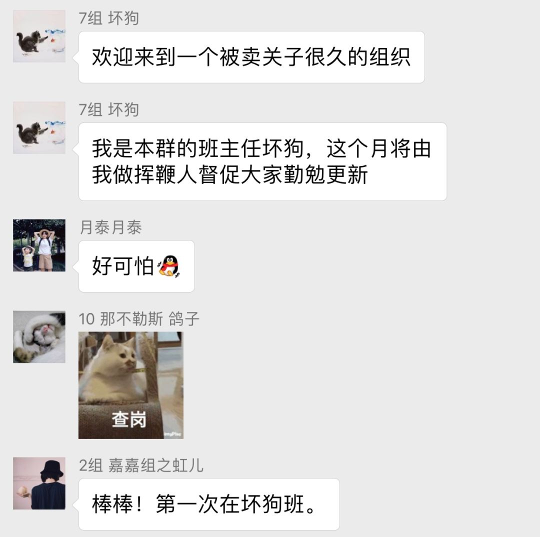 怀着忐忑的心情,神秘组织就这样开班了,荧幕的另一侧是想象中“挥舞着鞭子”的班主任,一个又一个鲜活的名字加入了群聊,老朋友们相互打着照面,“咦?你也在这里呀”,新伙伴们介绍着自己,仿佛各色的神秘药水一齐加入了烧瓶中,一会就活络了起来,咕噜咕噜冒着泡泡,发生了奇妙的化学反应。