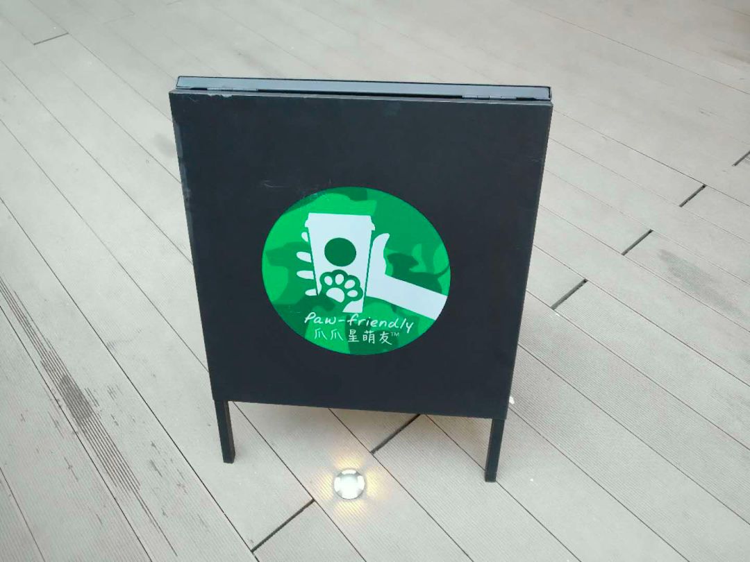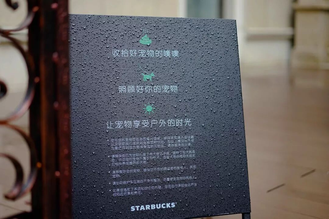 它的主人妆容精致,用着星巴克的手机壳,素颜的女伴背着一只星巴克的包。她们点了店里的限定新品层萃抹茶玛奇朵和其他一些饮品,然后坐在旁边配有拴狗桩的长椅上聊天。这个庭院虚掩的铁门边竖着一块牌子,正面写着“Paw-friendly 爪爪星盟友”,反面写着主人应该注意的各项事情。