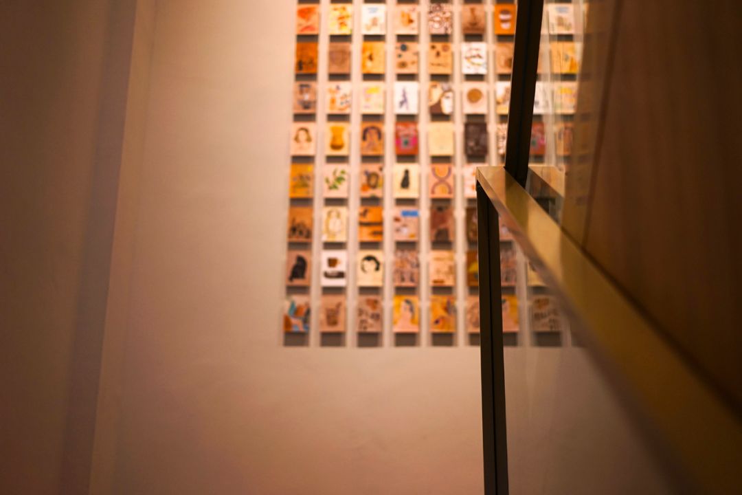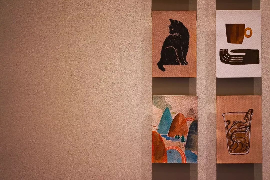 二楼阶梯拐角处还有156张同样以水彩形式呈现的明信片,涵盖了咖啡产地风景、咖啡冲煮、工坊烘培、上海文化、城市小资生活和星巴克咖啡六大主题,自己本人也养猫的设计师 Percy Lee 介绍时说:“不同的人会注意不同的画面,有些顾客一眼就看到了猫咪。”