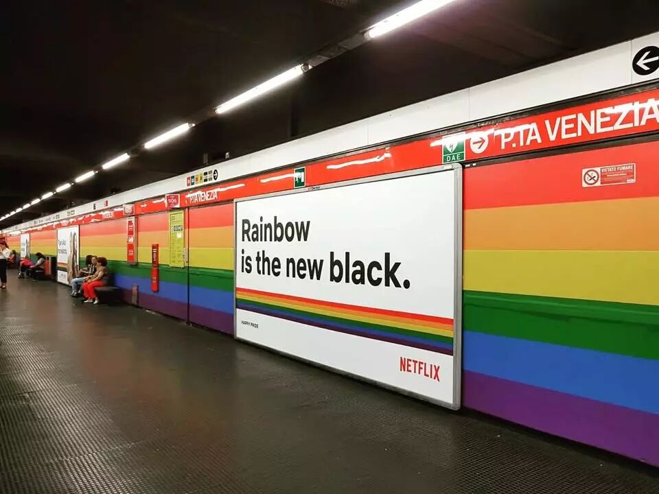 对许多公司来说,“政治正确”且流量惊人的骄傲游行是打广告的好机会,在去年米兰骄傲游行的赞助商中,就有GOOGLE和意大利电信巨头TIM,我之所以获悉这个活动,就是因为用谷歌地图app的时候,系统弹出了附近活动的通知,并将游行路线用醒目的六色笔标注出来。今年米兰市政府与美国著名的电视剧网站网飞(Netflix)联合推出彩虹装饰为骄傲游行造势,以官方立场公开表达对性少数文化的支持和认同,还是破天荒的头一回。