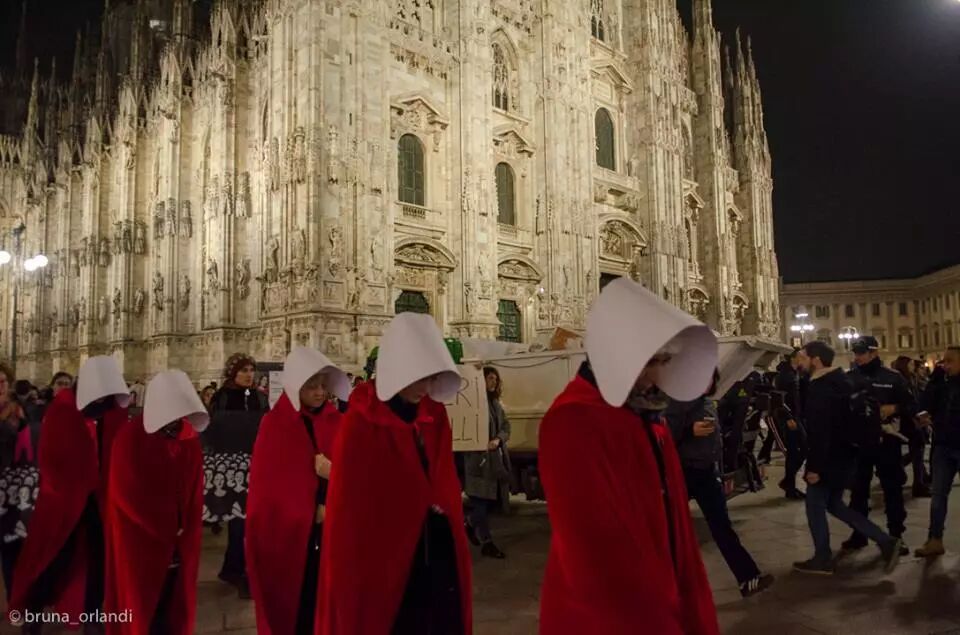 11月的一个傍晚,我看见一群红衣白帽的“使女”走过多莫广场。这是米兰最繁华的地段,汇集了来自世界的游客。她们高喊着抗议天主教原教旨主义的口号,在埃马努埃莱二世拱廊尽头的广场上点燃了红色烟雾弹,一群扛着长枪短炮的人跟着她们一路小跑。