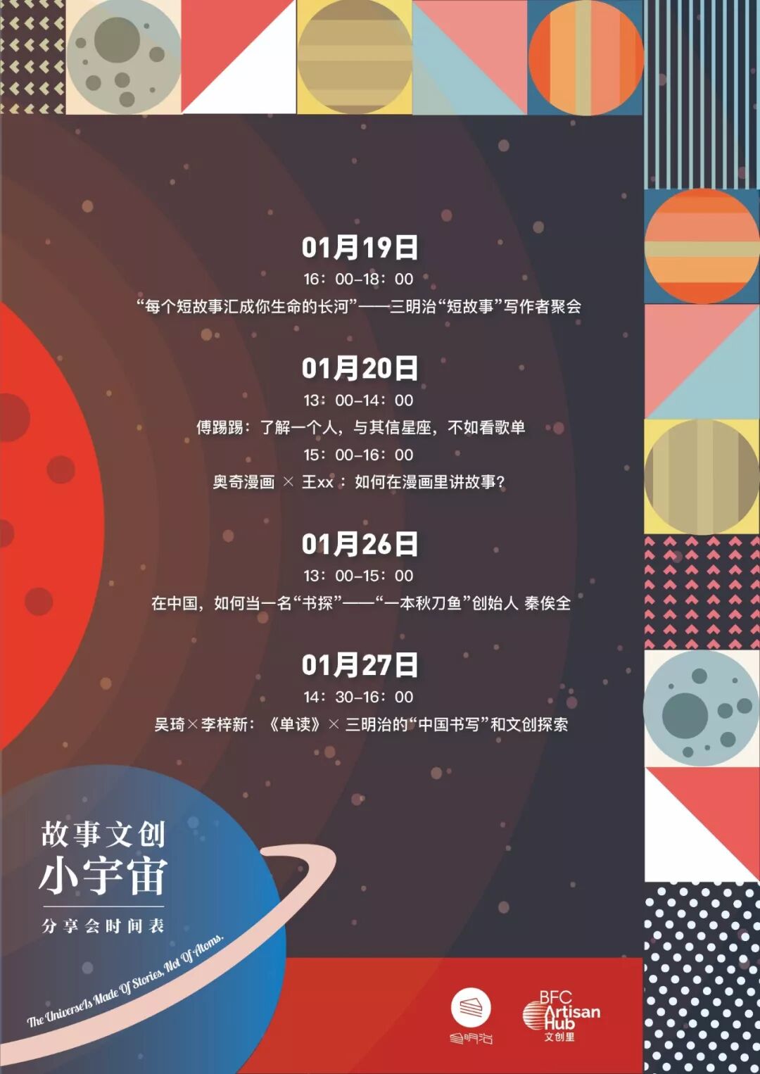 三明治2019写作生活节 故事文创小宇宙 时间 1月19日-20日(周六、周日) 1月26日-27日(周六、周日) 地点 上海BFC外滩金融中心 北区·文创里 上海市黄浦区 中山东二路600号 | |||