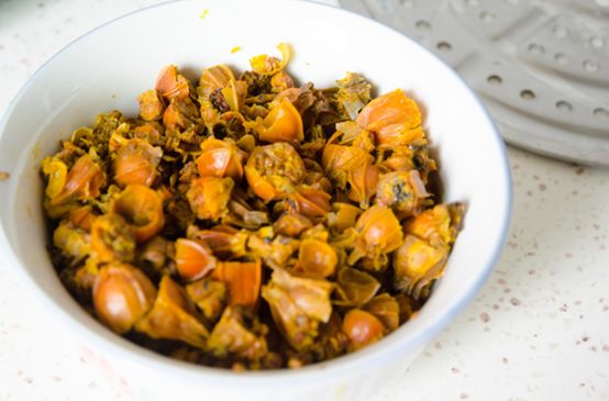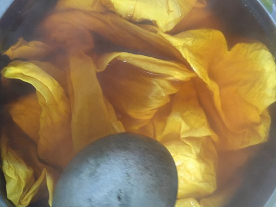 *白净的槐花煮出的汤液呈暗调的黄棕色,但与织物亲密接触后,却会神奇地转变成明亮的黄色。