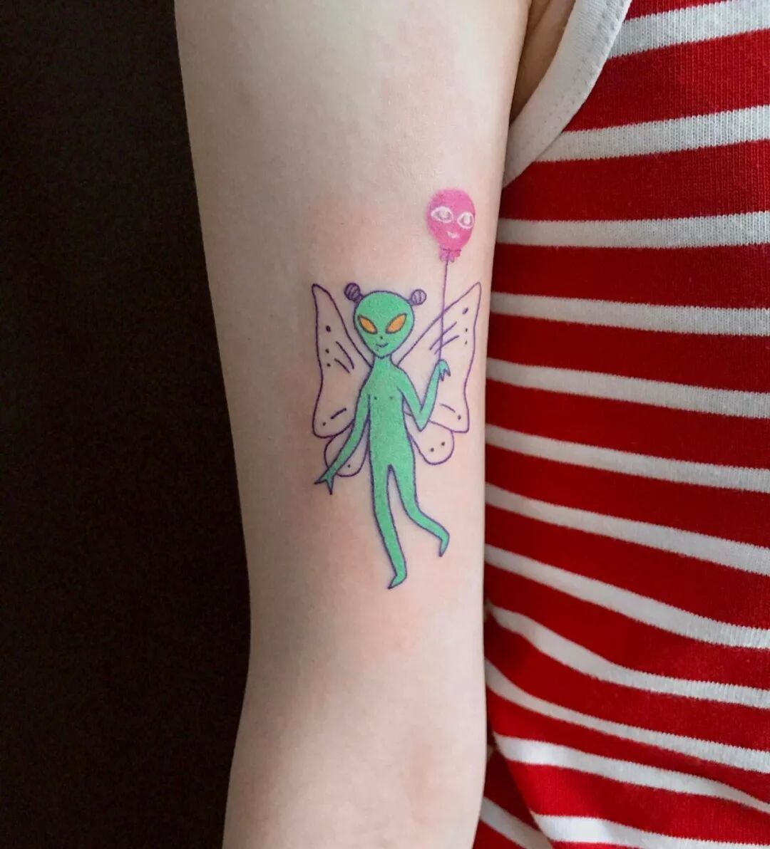 于是我改了一下我画的外星人的造型,赋予了我给它的意义。头上的两个小啾啾是我那段时间一直在扎哪吒头的发型,手里拿的人头气球是她的玩具,人类是她的玩具,还有她的翅膀,翅膀代表未来和我对自己的期许。画了很多关于外星人的小画以后,我冒出了想把它做成纹身的念头,两分钟画了一张草稿,第二天就去纹了。