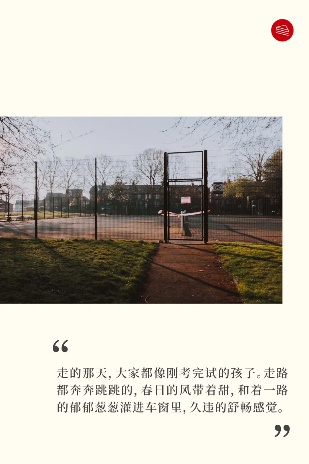 走的那天,大家都像刚考完试的孩子。走路都奔奔跳跳的,春日的风带着甜,和着一路的郁郁葱葱灌进车窗里,久违的舒畅感觉。