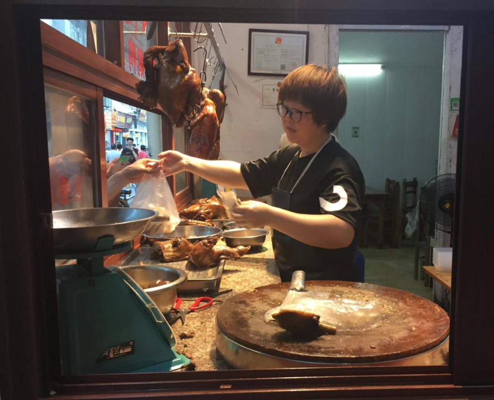 但她勇敢地跳出了舒适圈,在她家附近的市场,从太阳落山逛到天黑,还拍了这张熟食店老板的照片,人物表情动作都具备,还运用了“镜框”的构图原理。相信继续勇于尝试下去,她会拍下更多好照片。