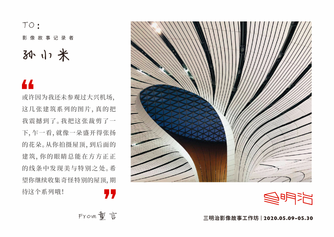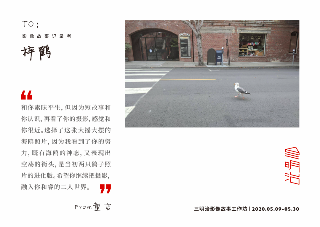 5月31日,第一期摄影故事工作坊结业时,我没有给学员颁发任何证书。但几乎每个学员,都收到一张私人订制明信片,上面既有我的寄语,也有来自他们在工作坊期间拍摄的作品,作为明信片背景。
