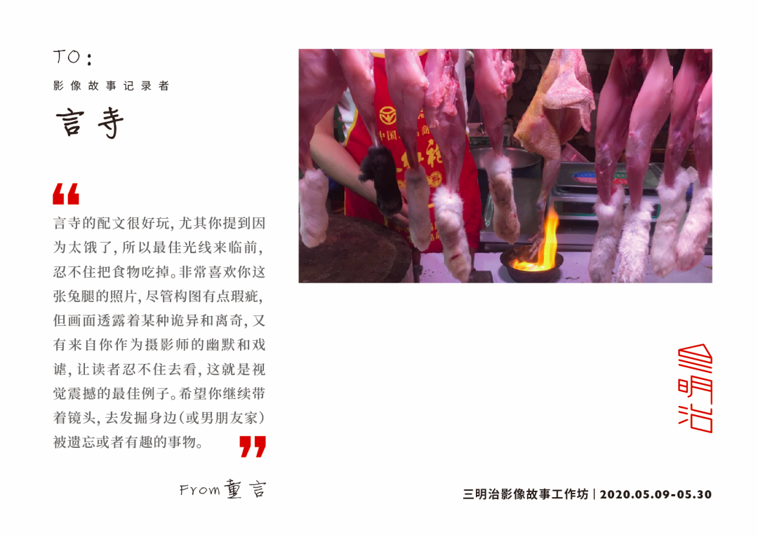 “影像故事工作坊,可能还是一个新鲜产物,不过挺棒的,国内很少能有这样的课程,然后童老师,挺会激发学生的拍摄热情的,也很投入授课,希望三明治能够将这种故事形式很好的推广下去,相信很多热爱摄影,并且喜欢写作的同学会爱上他,比如,我哈哈,然后很感谢三明治让我重拾了对于摄影的热情,学费没白交,哈哈。”