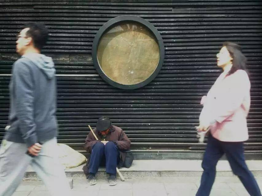 身在上海的 Tianxin 拍下了一张乞丐坐在路边的照片,配文是:人来人往的城市,都是过客。我超级喜欢这张照片,匆匆行人与坐在地上的乞丐反差特别大,看着甚至让人有点心酸。