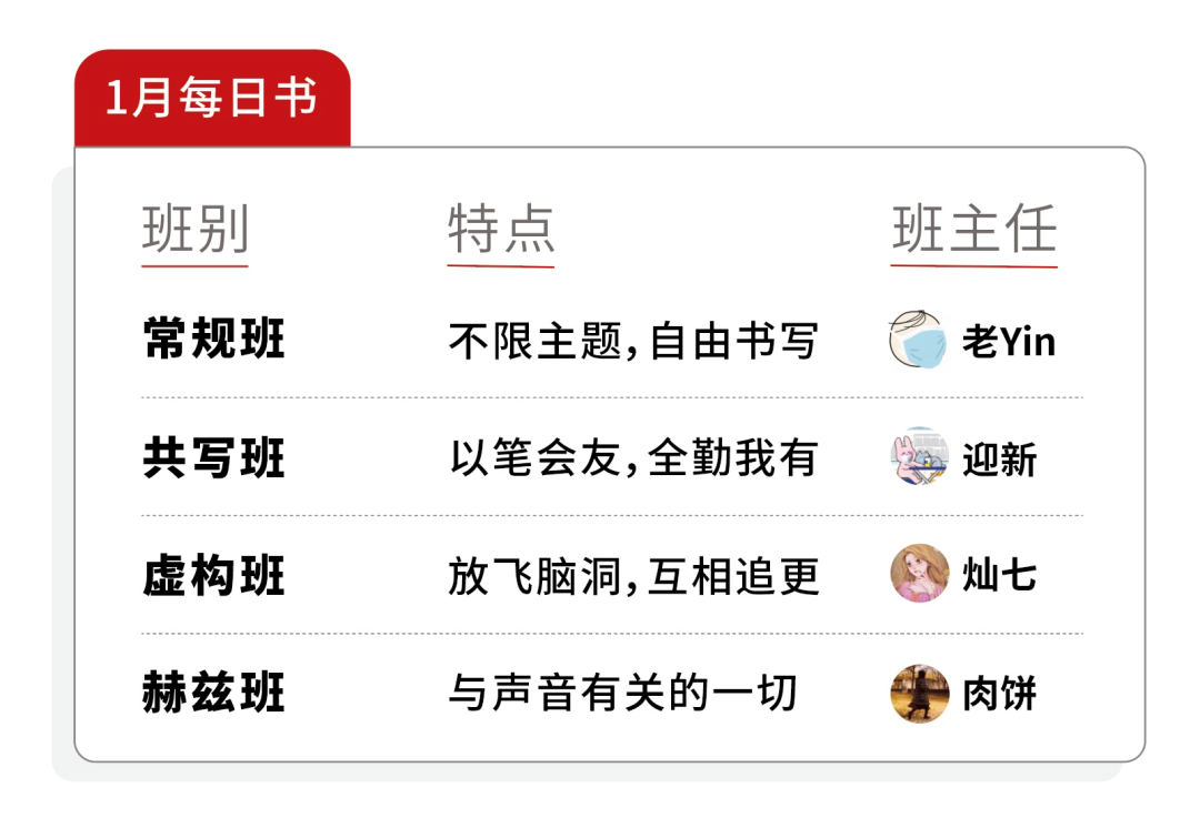 1月每日书除了首次推出的赫兹主题班,还有虚构班的返场,想写小说的朋友可以来这里。此外照常开设不限主题的常规班、匹配搭档的共写班,1月1日正式开写。