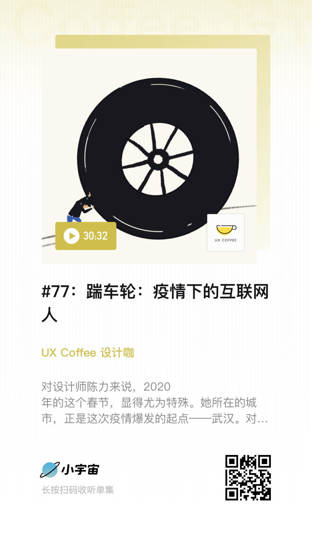 后来我们采访了三个互联网人,他们用不同的方式参与到了抗击疫情的过程当中。那期节目结尾用了非典时期的群星合唱《手牵手》,把音乐拖进剪辑软件播放的那一刻,我一下子就哭了。那是在我做播客的4年多里,第一次在剪辑的时候哭。我哭着导出音频文件,上传到各个平台,第77期《踹车轮:疫情下的互联网人》,也是我们从提出选题到发布节目整个过程用时最短的一期节目。
