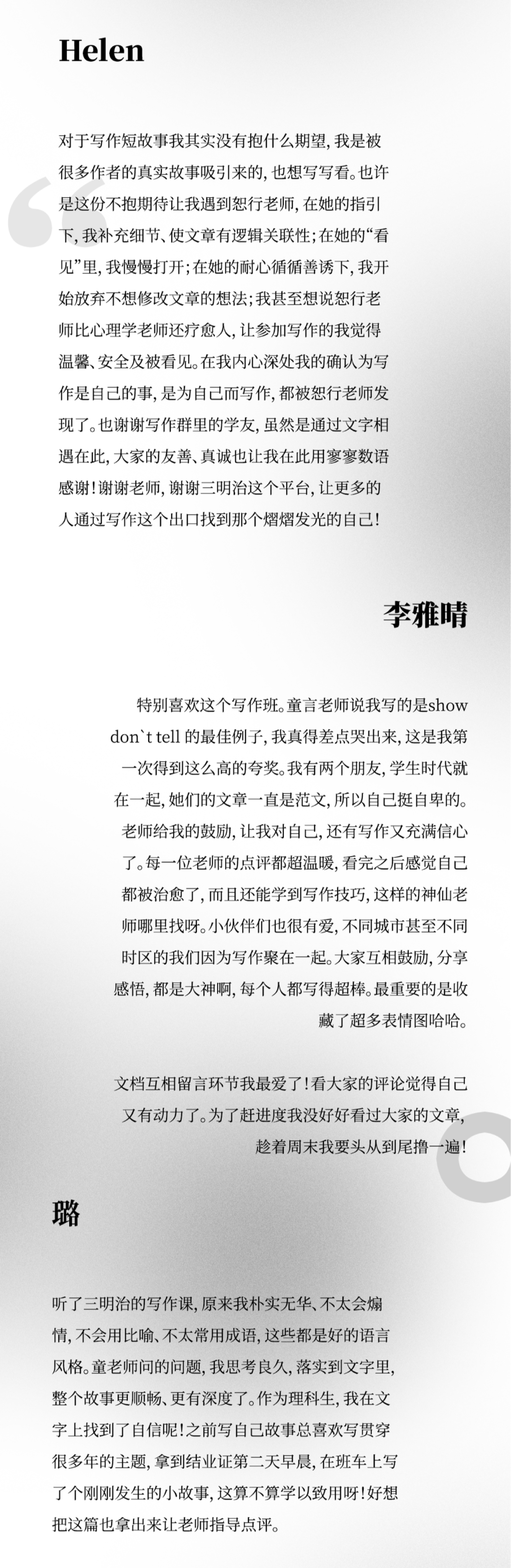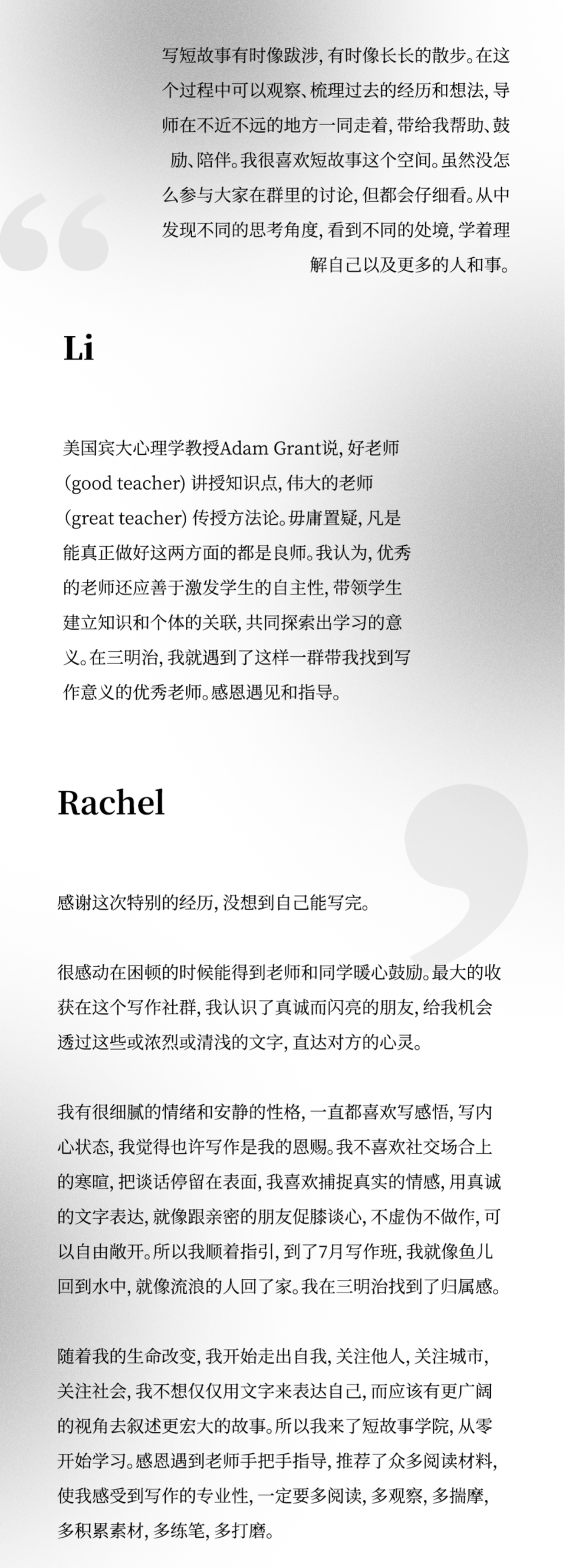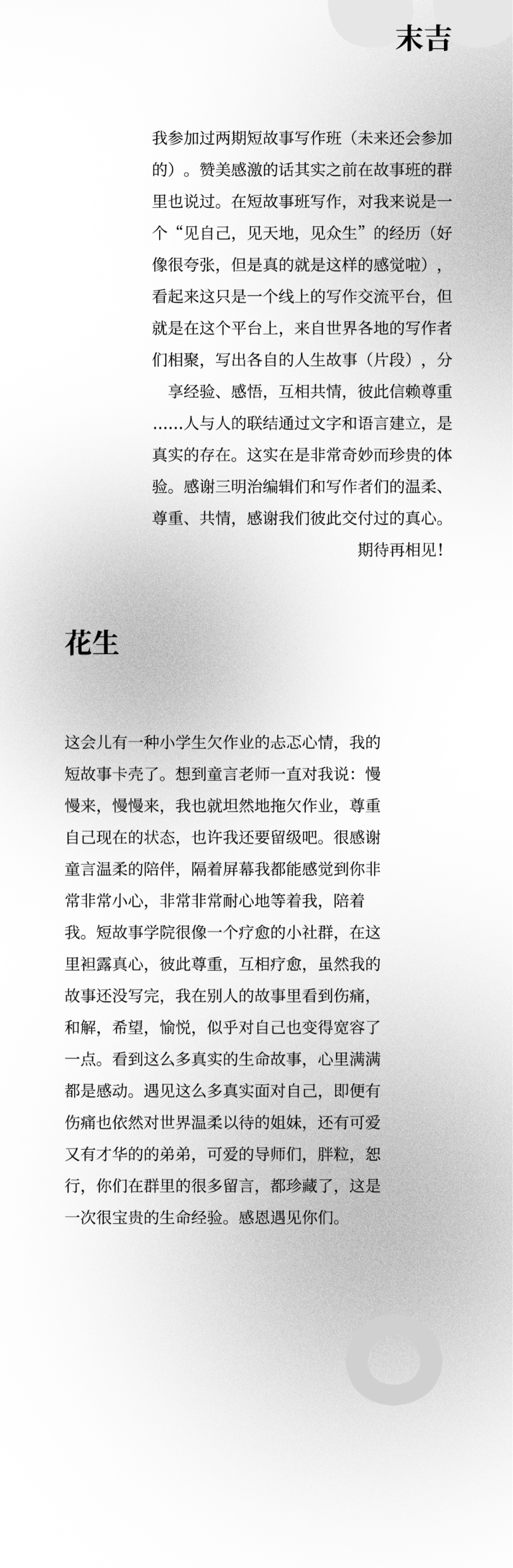 结束后,短故事的写作者们在这里写下了他们参加这一期写作课的感受。短故事的几位学员回溯了各自的故事,确认了写作对于自身的意义,以及参加短故事的感受与收获。