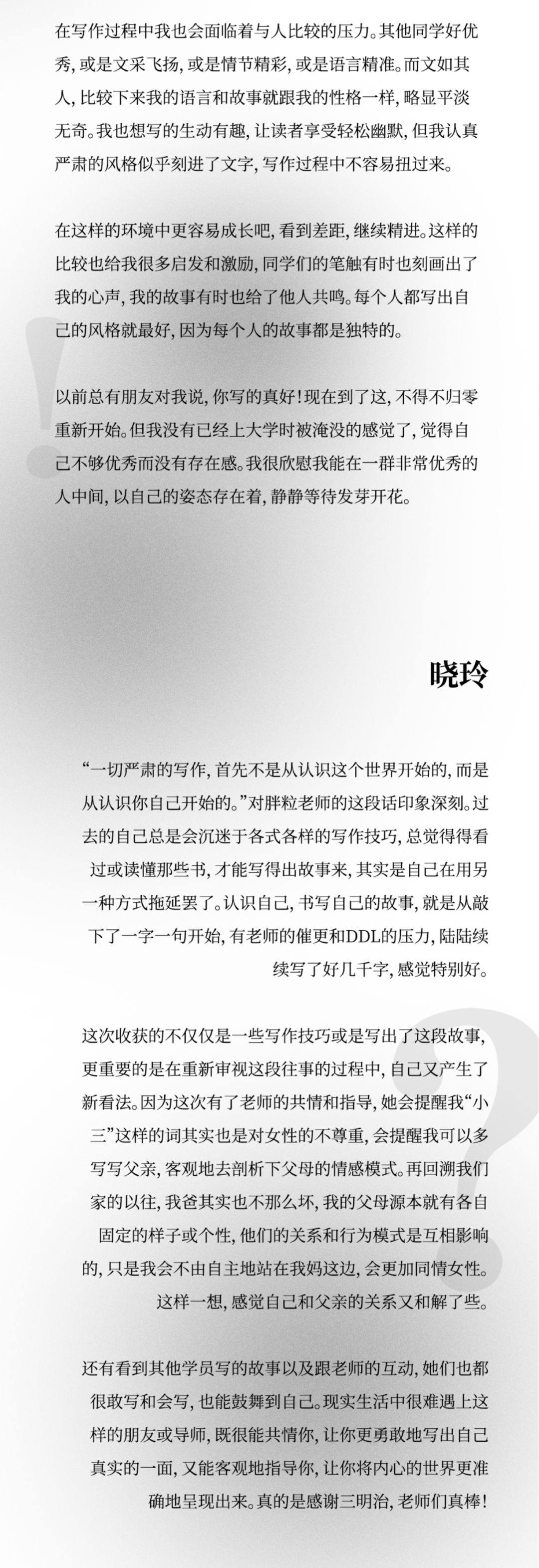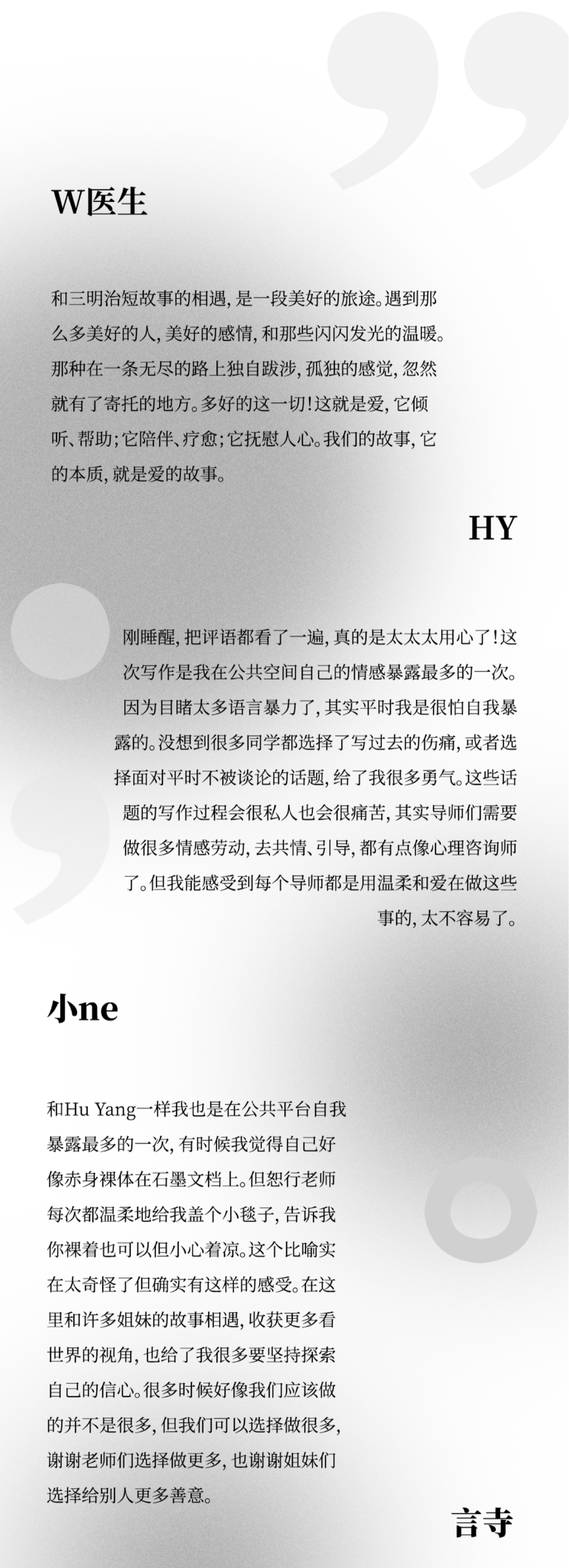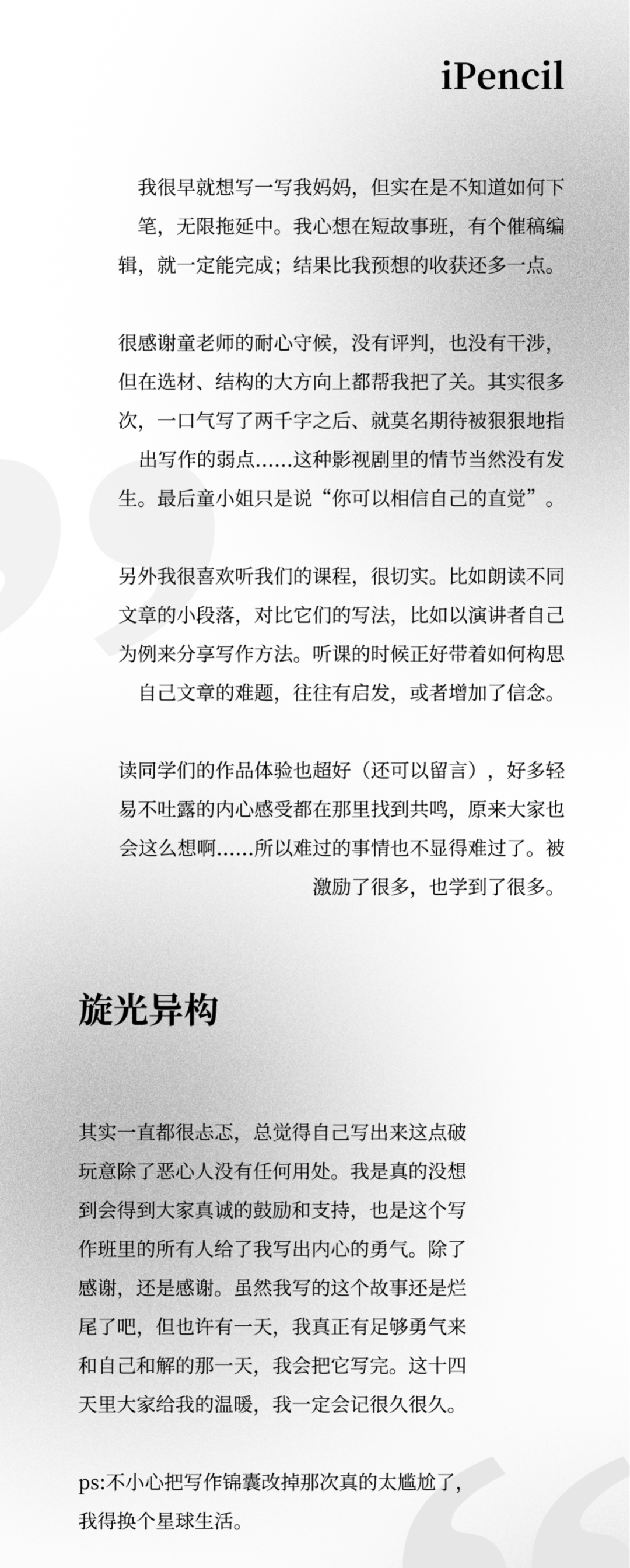结束后,短故事的写作者们在这里写下了他们参加这一期写作课的感受。短故事的几位学员回溯了各自的故事,确认了写作对于自身的意义,以及参加短故事的感受与收获。