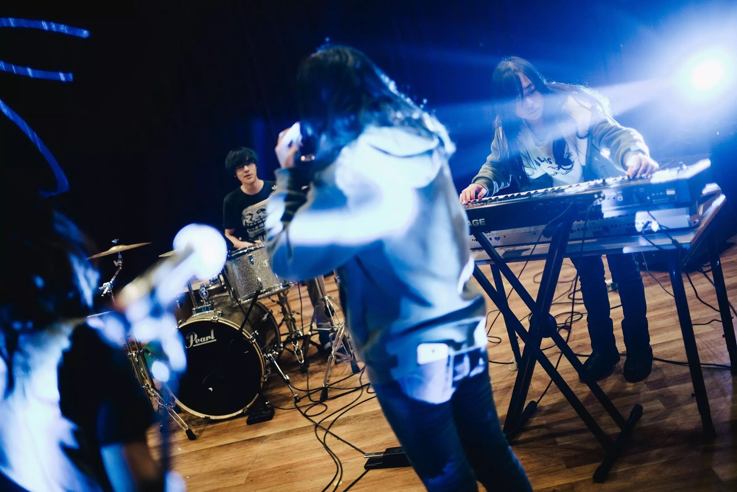 王雨桦:当时是在高中部的实现室里排练的,因为只有那里有很多插座可以支持那么多电子乐器和音箱(笑)。我们每周在社团活动的时间里都会排练。一直到毕业的那个暑假,我们还是会约着去外面的录音房排练。其实当时并不觉得上台表演多重要,这种大家一起摸索一首曲子,从扒谱子,到层次不齐的配合再到最后让我们自己满意的一首音乐的过程就已经足够让人享受了。直到现在,每当听到一起表演过排练过的曲子,那些一起排练的场景又历历在目了。
