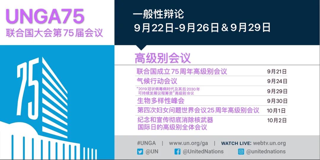 第75届联合国大会一般性辩论将于纽约时间9月22日至26日及29日每天上午9时至下午9时举行。主题是:“我们想要的未来,我们需要的联合国:重申我们对多边主义的集体承诺——通过有效的多边行动抗击2019冠状病毒病。”