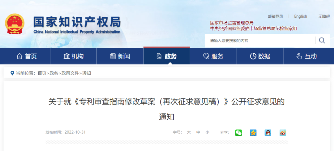 关于就《专利审查指南修改草案(再次征求意见稿)》公开征求意见的通知