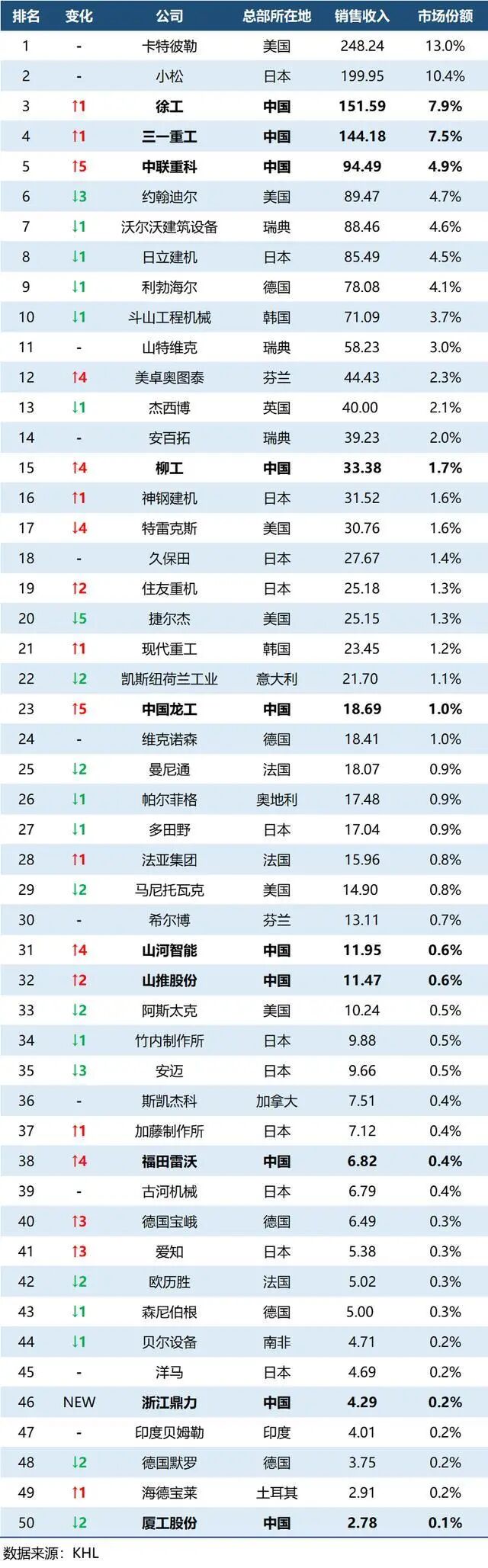 近日,2021全球工程机械50强公布,中国的工程机械厂中,徐工集团、三一重工、中联重科也不负众望,占据前五名。