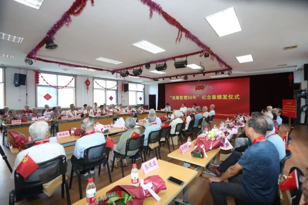 仪式现场,卢建军、王树国等为在场老党员代表逐一颁发“光荣在党50年”纪念章并献花束表示敬意,向50余载不忘初心、坚守信念、一心向党的老党员们送上最诚挚的问候。