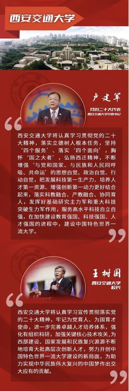 西安交通大学校长王树国表示,聆听了报告备受鼓舞,倍感振奋,对党和国家未来发展充满信心。报告高屋建瓴、立意高远、主题鲜明、内涵丰富、重点突出。西安交通大学将认真学习宣传贯彻落实党的二十大精神,牢记为党育人、为国育才使命,胸怀“国之大者”,弘扬西迁精神,更加突出培养一流人才、服务国家战略需求、争创世界一流的导向,进一步完善卓越人才培养体系,强化有组织科研,加强关键核心技术攻关,为西部建设、国家发展和民族复兴源源不断地培育大批高层次创新人才。