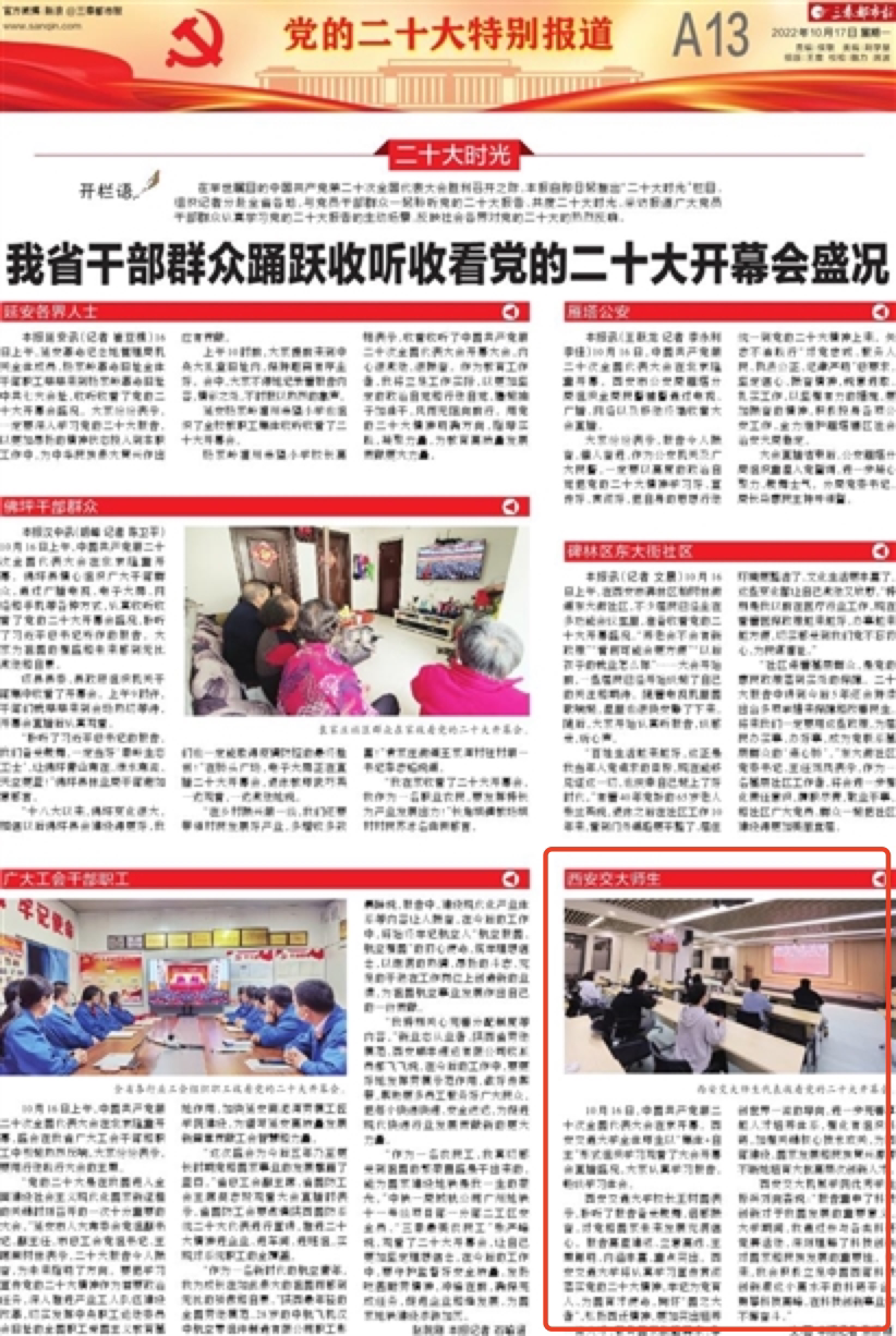 继人民日报、光明日报、央视、新华社、中国教育报、中国新闻网、陕西日报、陕西广播电视台等媒体报道交大师生学习党的二十大报告反响后,近日,中国新闻网、中国教育报、新华每日电讯、科技日报、中国组织人事报、团结报、陕西日报、陕西广播电视台、学习强国陕西平台、各界导报、三秦都市报、华商报、西安日报、西部网、陕西头条、西安发布等媒体再次聚焦交大师生热议党的二十大报告。