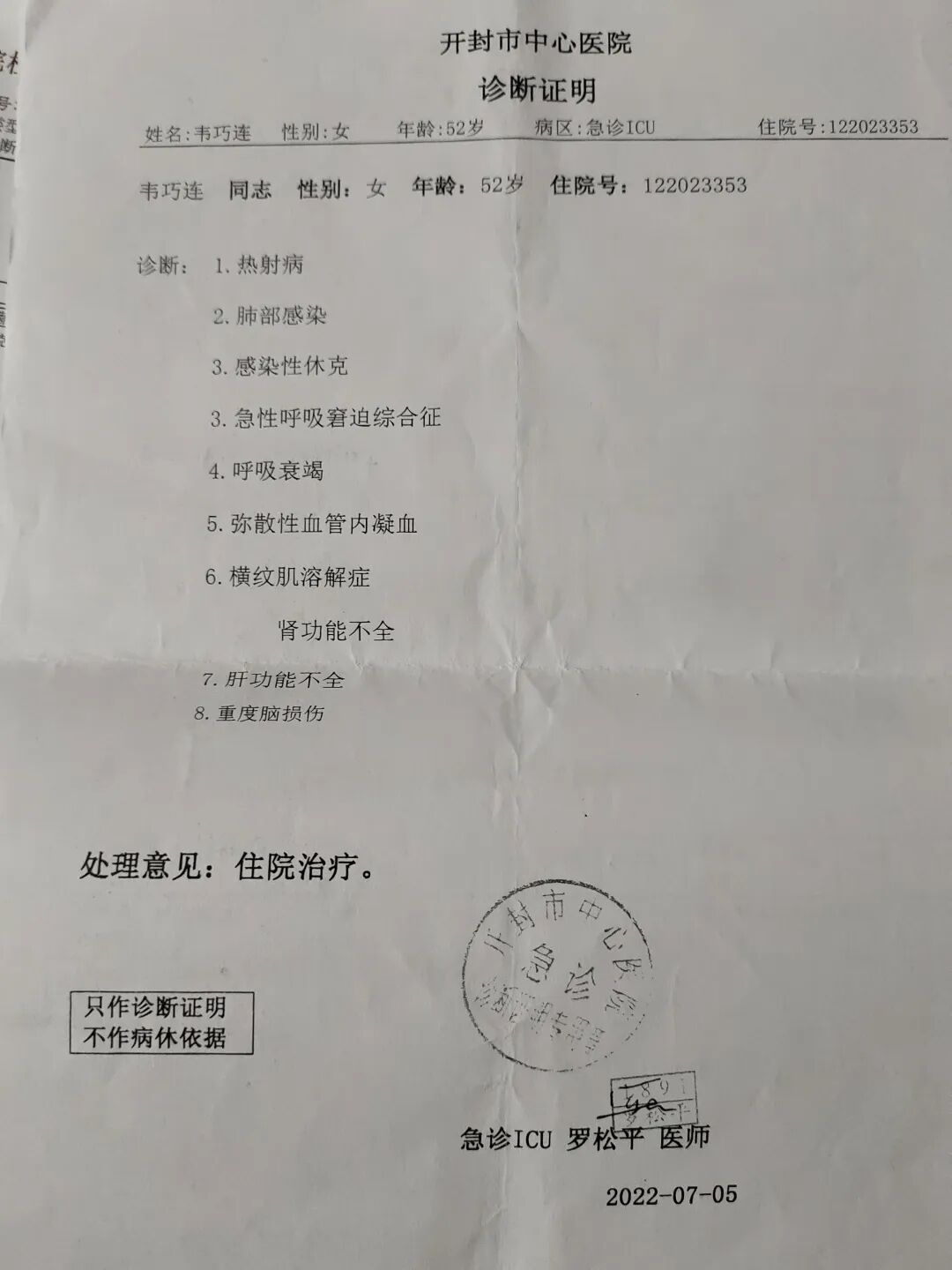 7月5日,韦巧连住进ICU第11天的诊断书