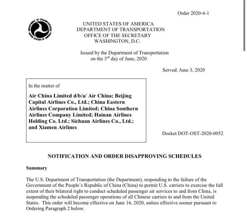上述命令宣称,美国交通部因中国“未能允许美国承运人实现往返中国的定期客运航空服务,无法行使双边权利的全部内容”,将暂停所有中国航空公司往返美国的定期航班运营。该命令将于6月16日生效。