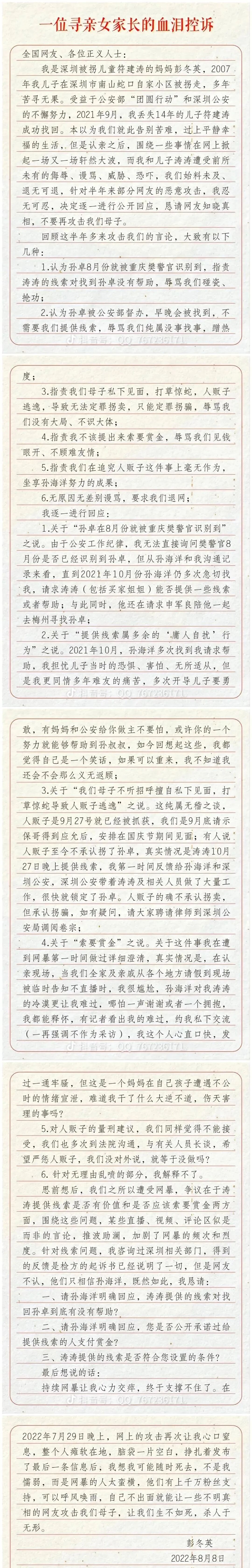 8月9日晚,彭冬英发文表示,2021年9月,儿子符建涛被找回后,因“符建涛提供线索帮助找到孙卓”的相关话题受到网友攻击。她提到,有网友攻击符建涛提供线索对于找到孙卓没有帮助,纯属抢功、碰瓷;另有网友指责她不该向孙海洋索要赏金,属于见钱眼开。