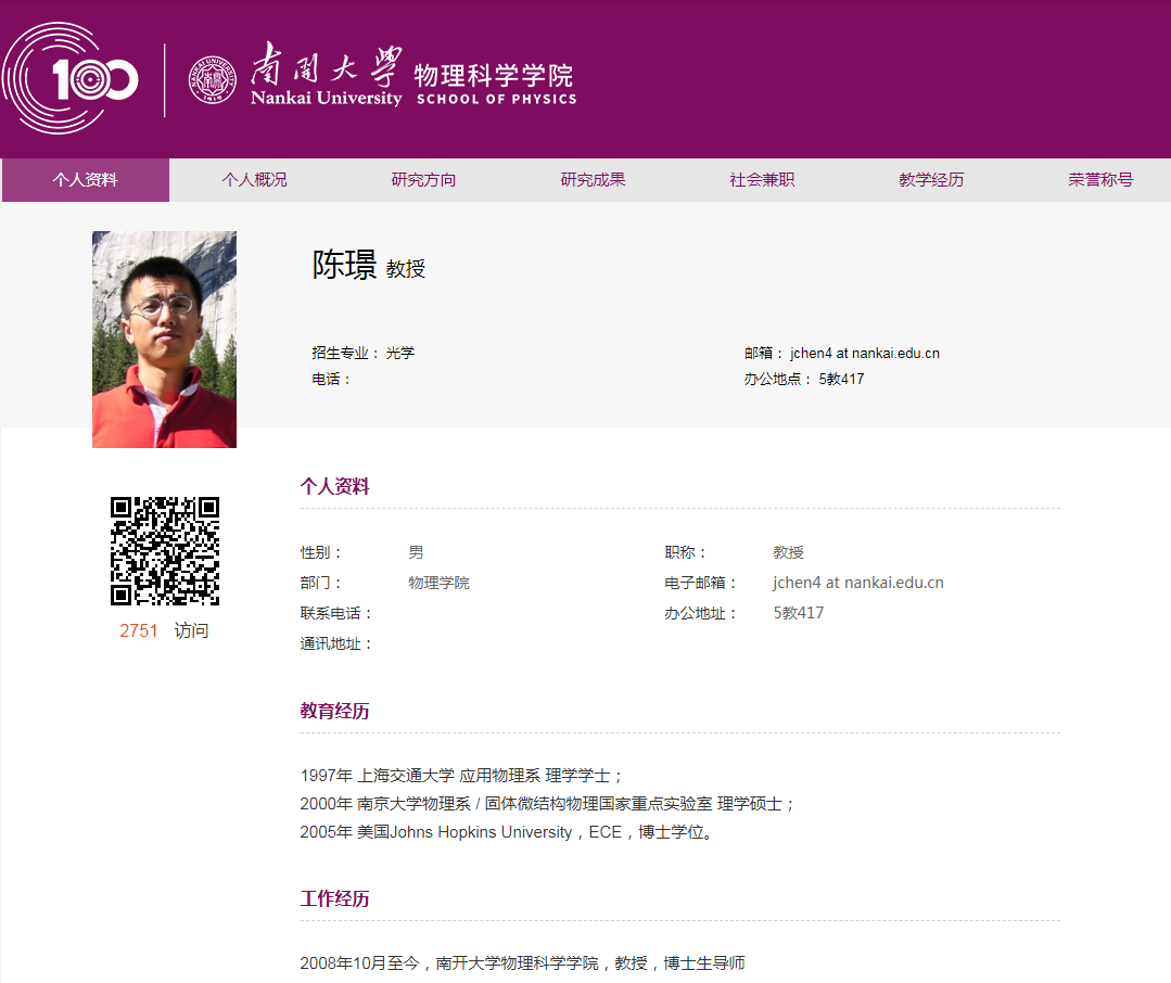 随着胡教授的简历登上热搜,有网友发现了南开大学物理学院另一位有趣的教授:陈璟教授。点开他的主页甚至还自带BGM。