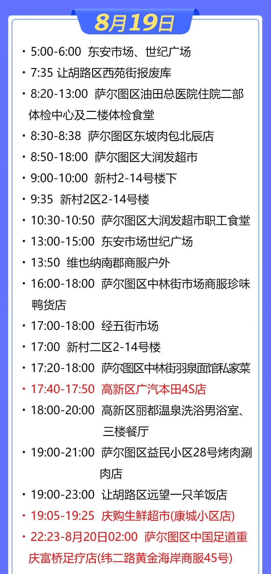 8月19日 19:05-19:40,高新区庆购超市(康城店);