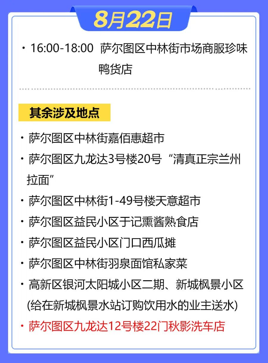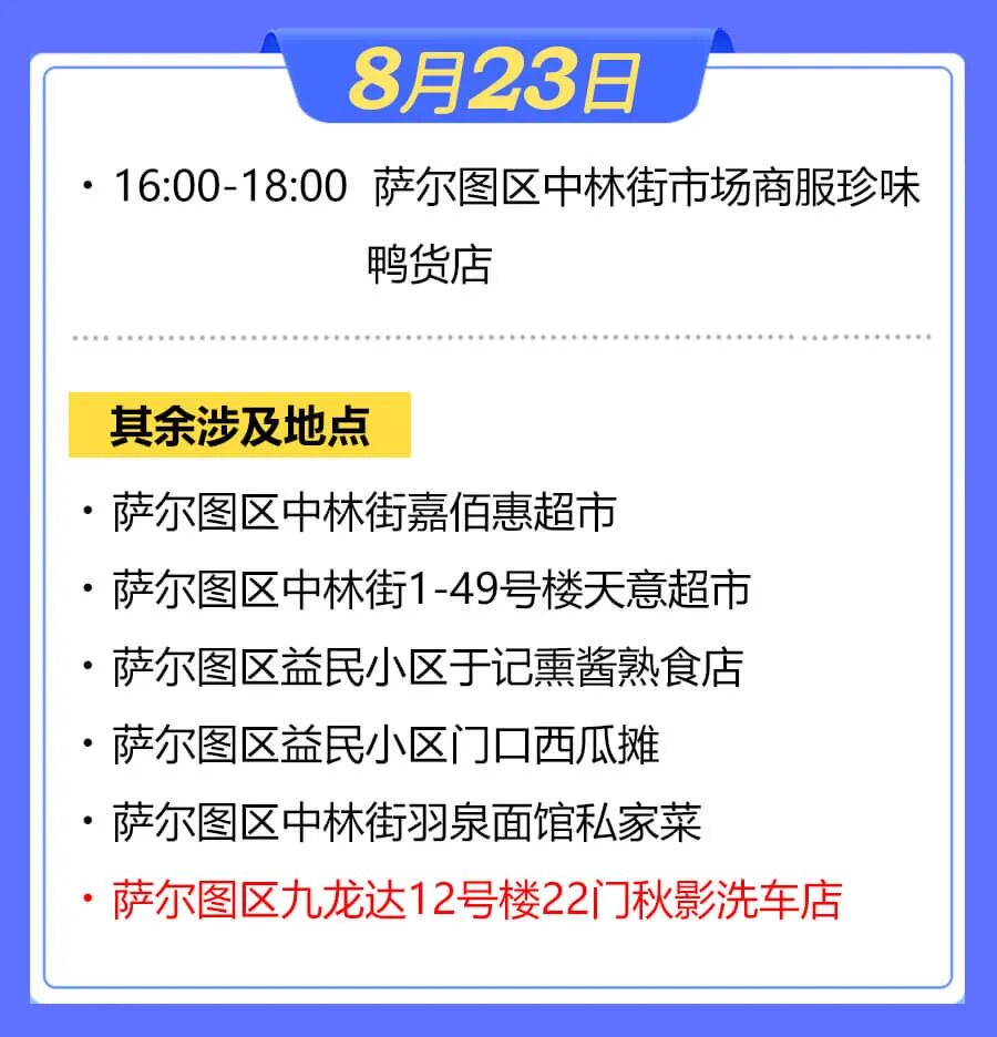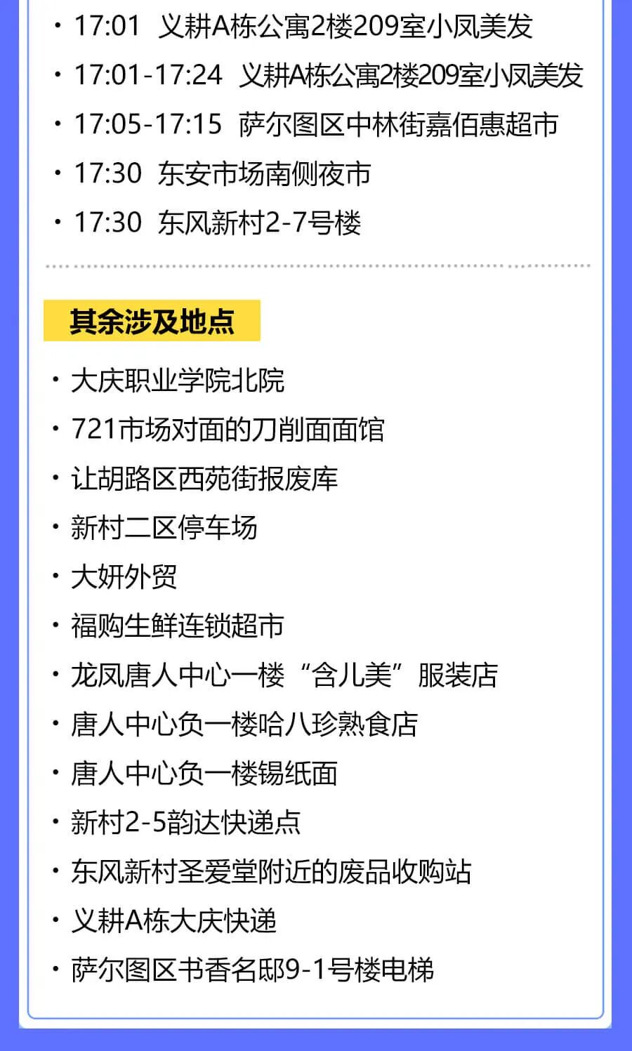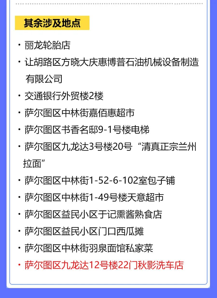 据大庆市萨尔图区应对疫情工作领导小组指挥部消息,萨尔图区部分新冠肺炎无症状感染者曾在以下场景活动,现寻找以下时间节点的涉疫场所暴露人员: