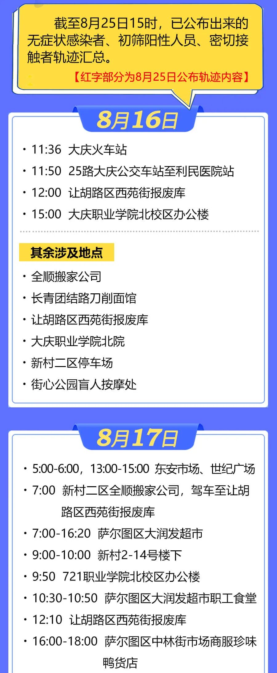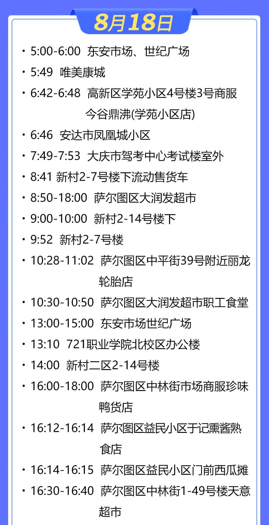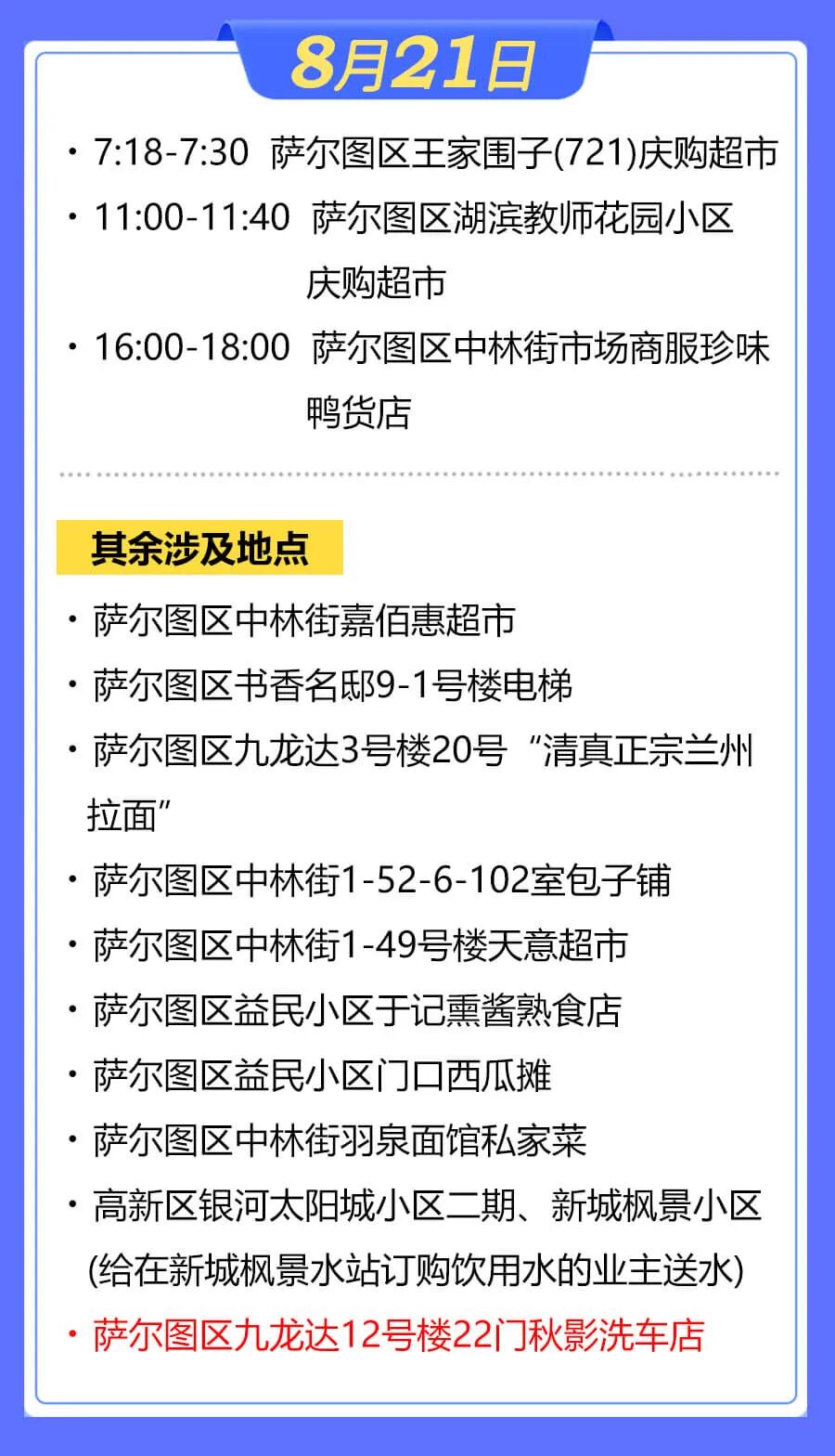 据大庆市萨尔图区应对疫情工作领导小组指挥部消息,萨尔图区部分新冠肺炎无症状感染者曾在以下场景活动,现寻找以下时间节点的涉疫场所暴露人员:
