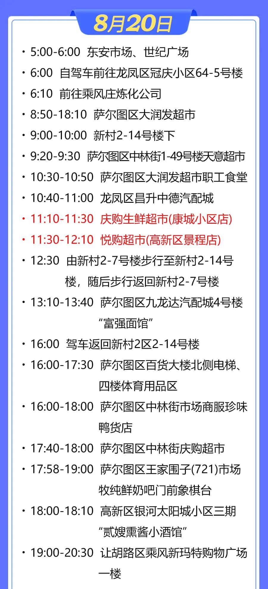 8月20日 08:50-09:20,高新区庆购超市(康城店);