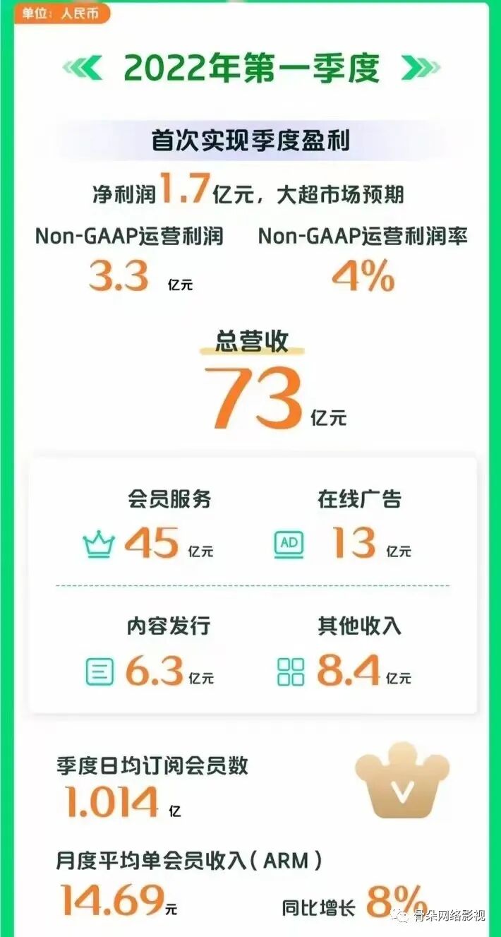 据财报显示,爱奇艺2022Q1营收73亿元人民币,其中会员服务营收45亿元,同比增长4%。日均订阅会员数1.014亿,较去年Q4净增440万。首次实现季度盈利,净利润为 1.691 亿元,超市场预期。