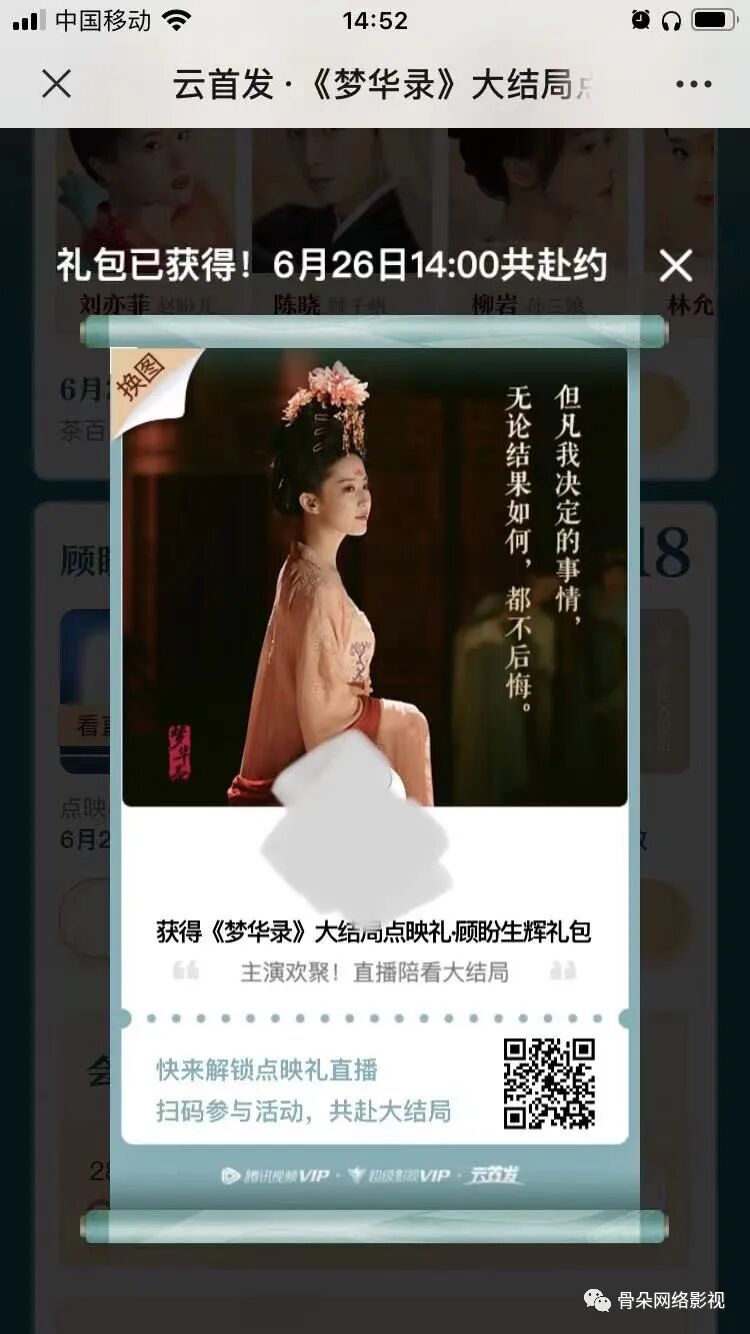 6月23日,腾讯视频推出《梦华录》大结局点映礼,VIP会员只要购买价值18元的“点映礼直播(含回放)观看券”,就可以观看点映直播及大结局,或者通过2888会员积分限量免费兑换、抽奖免费赢的方式免费获取“顾盼生辉”礼包。