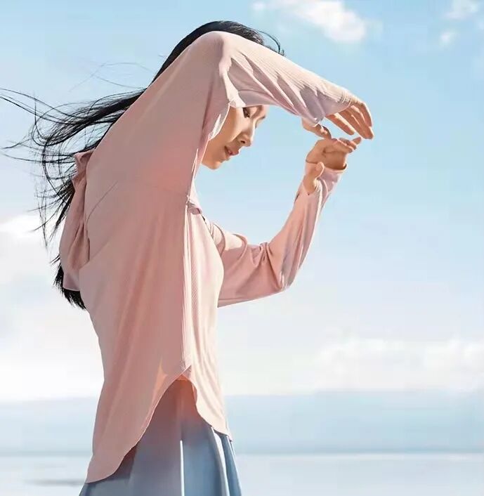 防晒衣的面料含有高浓度特殊陶瓷微粒,可以反射紫外线。还采用安踏冰肤科技,具有降温的作用。怎么说,穿上这件防晒衣就好像整个人泡在沁凉的水里,体感非常冰爽!