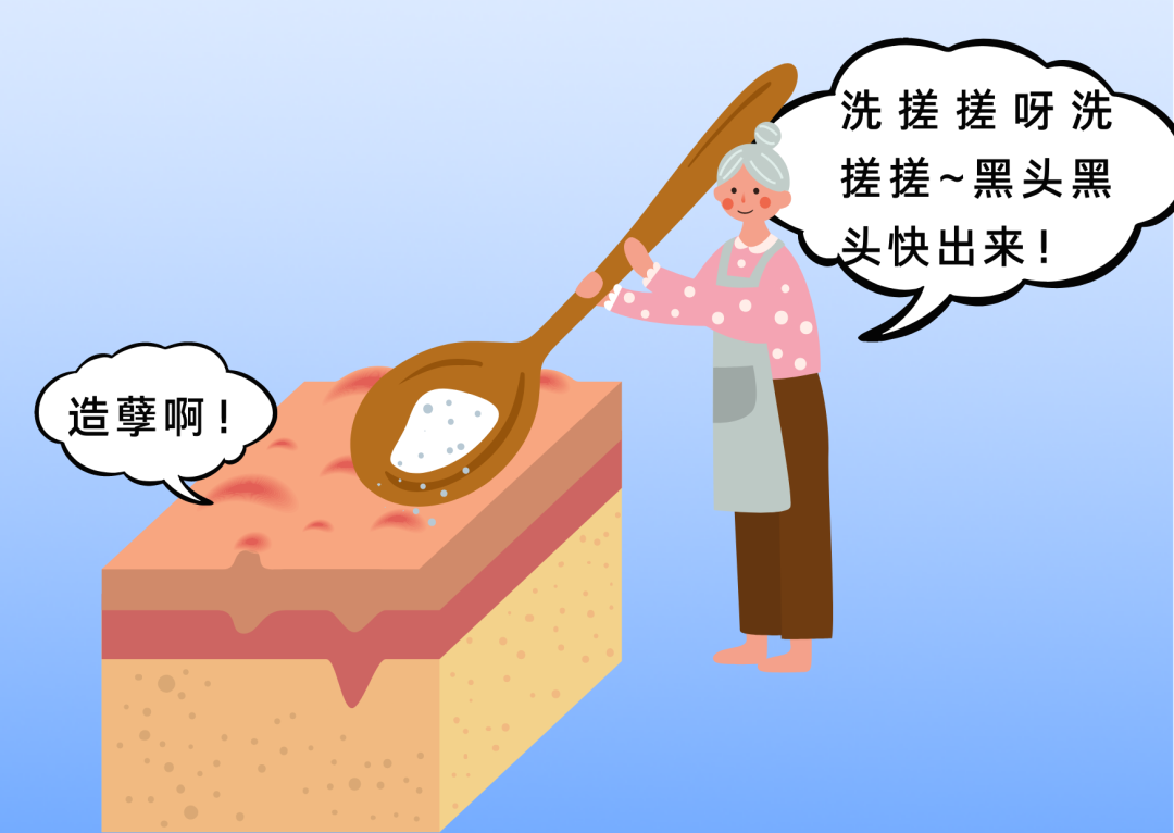 说来也是一把辛酸泪,想当年我还天真单纯(其实是傻)的时候,还真的尝试过这个方法!用盐在鼻子上揉搓按摩,据说可以把黑头搓出来。好在我皮厚,倒也没出现什么不可挽回的皮肤问题。